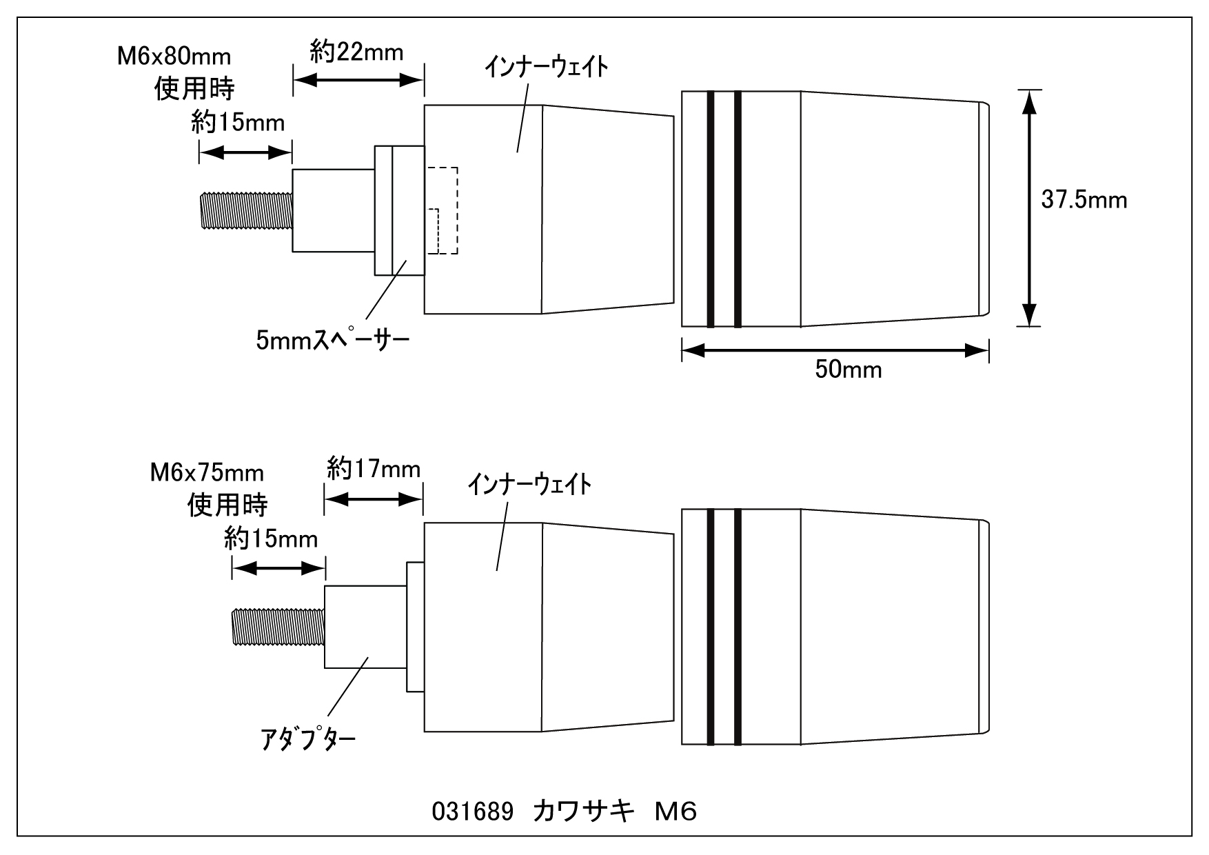 “超!重量級”ウルトラヘビーバーエンド!カワサキ車純正M6タイプ(純正ハンドルバー用)真鍮製インナーパーツ内蔵の防振ウェイトバランサータイプのバーエンドです。アウターパーツはアルミ製となっていますので車体に合わせてカラーをお選びいただけます。付属パーツの組み合わせにより、カワサキ車M6タイプの純正ハンドルバーに対応が可能です。取り付け用ボルトは2種類(M6×75、80mm)付属しております。【素材/材質】インナー:真鍮メッキ仕上げアウター:アルミアルマイト/メッキ仕上げ【重量】1個あたり約340g【付属品】カワサキ車専用M6アダプター:2個5mmスペーサー:2個M6×75mmステンレスキャップボルト:2本M6×80mmステンレスキャップボルト:2本【仕様】・防振ウェイトバランサータイプ・最大外径:37.5mm・日本製※使用するグリップ・車種によってはワッシャー等で調整が必要な場合があります。※ボルトの飛び出しは、取り外したバーエンドと比較し調整してください。※車体によっては付属のボルトでは不十分な可能性も考えられますので予めご了承ください。※取り付けの際、脱落防止の為、ネジロック剤の塗布を推奨致します。【適合参考車種】NINJA250SL(2015-2016)NINJA650(2017-2020)Z650(2017-2020)NINJA H2-SX(2018-2019)NINJA H2-SX SE(2018-2020)NINJA H2-SX SE+(2019-2020)