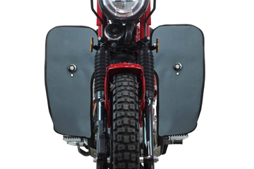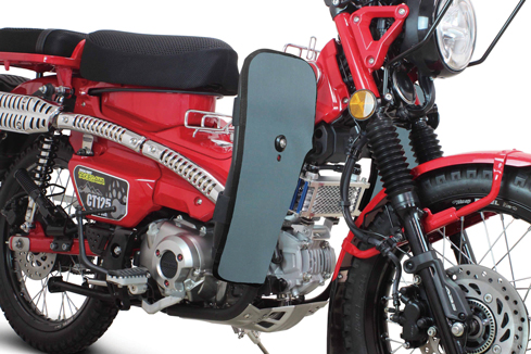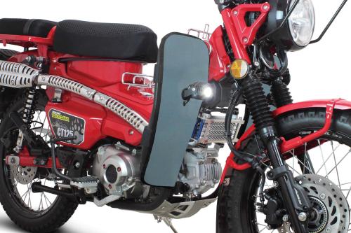 本製品を装着することで、立ちごけ等の軽度な転倒に対し、エンジンやチェンジペダルへのダメージを軽減します。又、付属のレッグシールドをサイドバンパーに装着することで、風防効果を得ることができます。これにより、ライダーの疲労を軽減すると共に走行中、フロントタイヤが巻き上げる水や泥などから自身を守ることが出来ます。レッグシールド(左右)の装着は、裏面にあるベルクロをパイプに巻きつけ、中央にあるボスにスチール製ボルトとアルミ削り出しリテーナーでしっかりと固定します。この固定部分のボスには、フォグランプキット(別売)を装着することができます。更にサイドバンパー本体のストレート部分には、アクションカメラやペットボトルホルダー(別売)なども装着できます。サイドバンパー本体:スチール製パイプブラック塗装仕上げ。レッグシールド:強化ナイロン製純正アンダーガードをそのまま使用します。注意事項シールドの生地自体には、防水加工は施しておりません。使用する場合は必ず防水スプレーにて防水加工を行い装着してください。CT125用フォグランプキット(05-08-0502/05-08-0503/05-08-0522/05-08-0523/05-08-0574/05-08-0575)とは干渉する為、同時装着は出来ません。