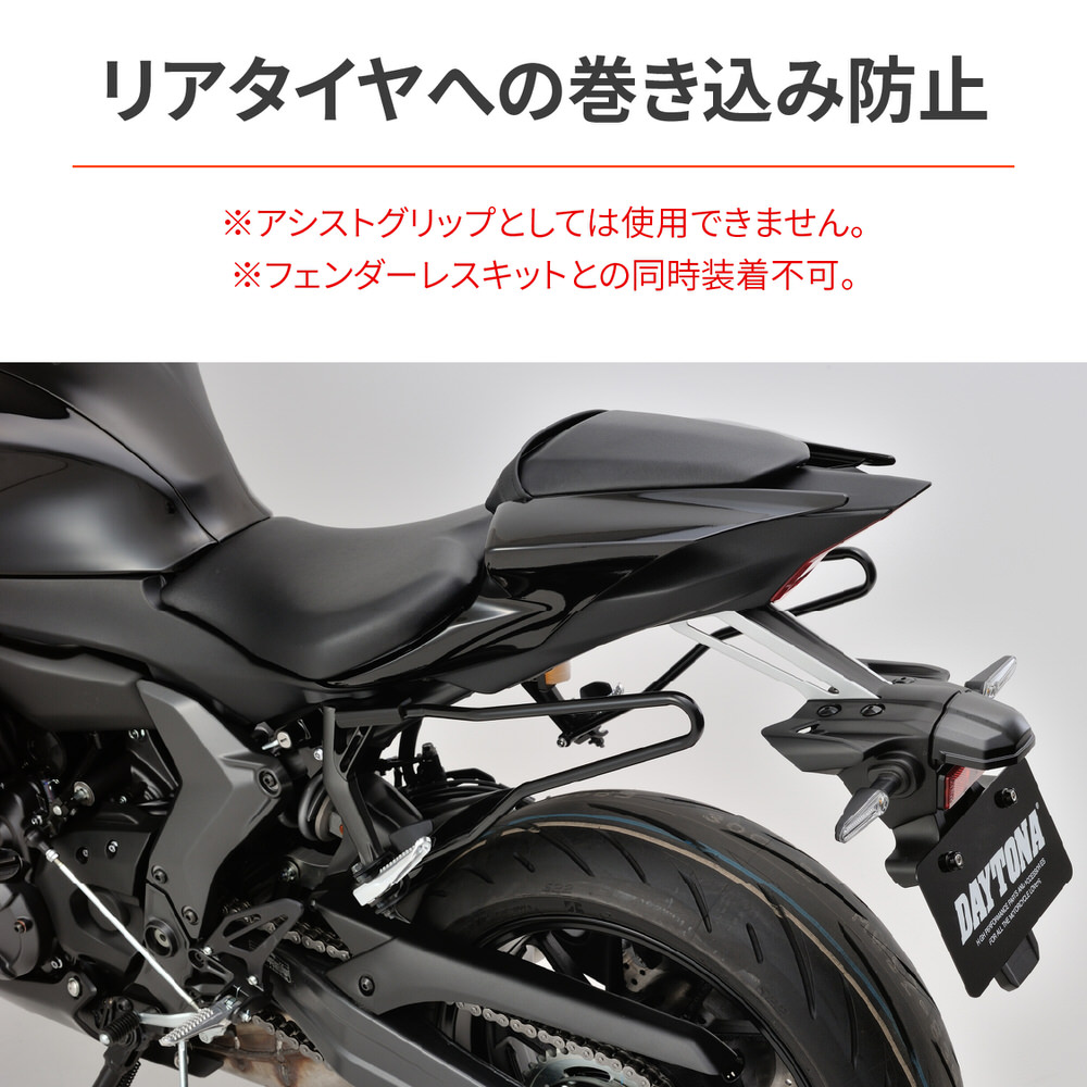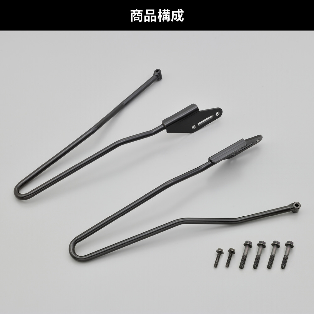 スポーツモデルに振分け型サイドバッグを装着した際の安定性を高める補助サポートバー。走行中の不安や危険を解消(リアタイヤへの巻込み防止)→バッグをしっかり支えるパイプレイアウトだから高速走行時でも安心して運転に集中できます。左右セットマットブラック塗装※本製品は、アシストグリップとして使用はできません。破損する恐れがあります。※デイトナ社および社外フェンダーレスキットとの同時装着はできません。