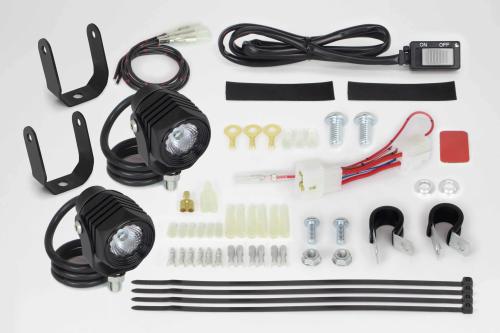 ノーマルヘッドライトの補助ランプとしてご使用頂く事で、走行時の視認性が向上し、夜間走行の安全性を高めます。又、高輝度により、夜間での車両の存在感を高め、他のライダーや車からの認識がしやすくなり、事故防止対策としても貢献します。更にON/OFFスライドスイッチが付属している為、見通しが悪い場所や夜間時などの必要に応じてご使用頂けます。本製品は車両側の配線加工の必要が無く、キットの構成部品により、フォグランプを簡単に取付け出来ます。商品同梱のクランプステーを使用し、ヘッドライトユニットステーに装着します。又、オプションコードが付属している為、簡単なギボシ加工のみで、車両に配線接続出来ます。LEDチップは非常に高輝度ながら低消費電力(1灯約6.5W)を実現し、小排気量車など、発電量があまり大きくない車両であっても使用可能です。インジケーターランプ付きON/OFFスイッチ付属インジケーターランプを内蔵することで、目視でランプ点灯のON/OFFを確認することが可能なります。