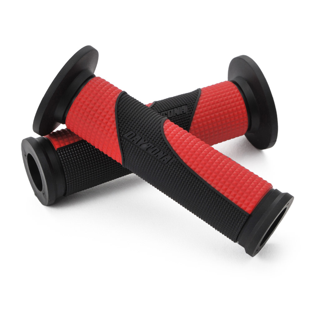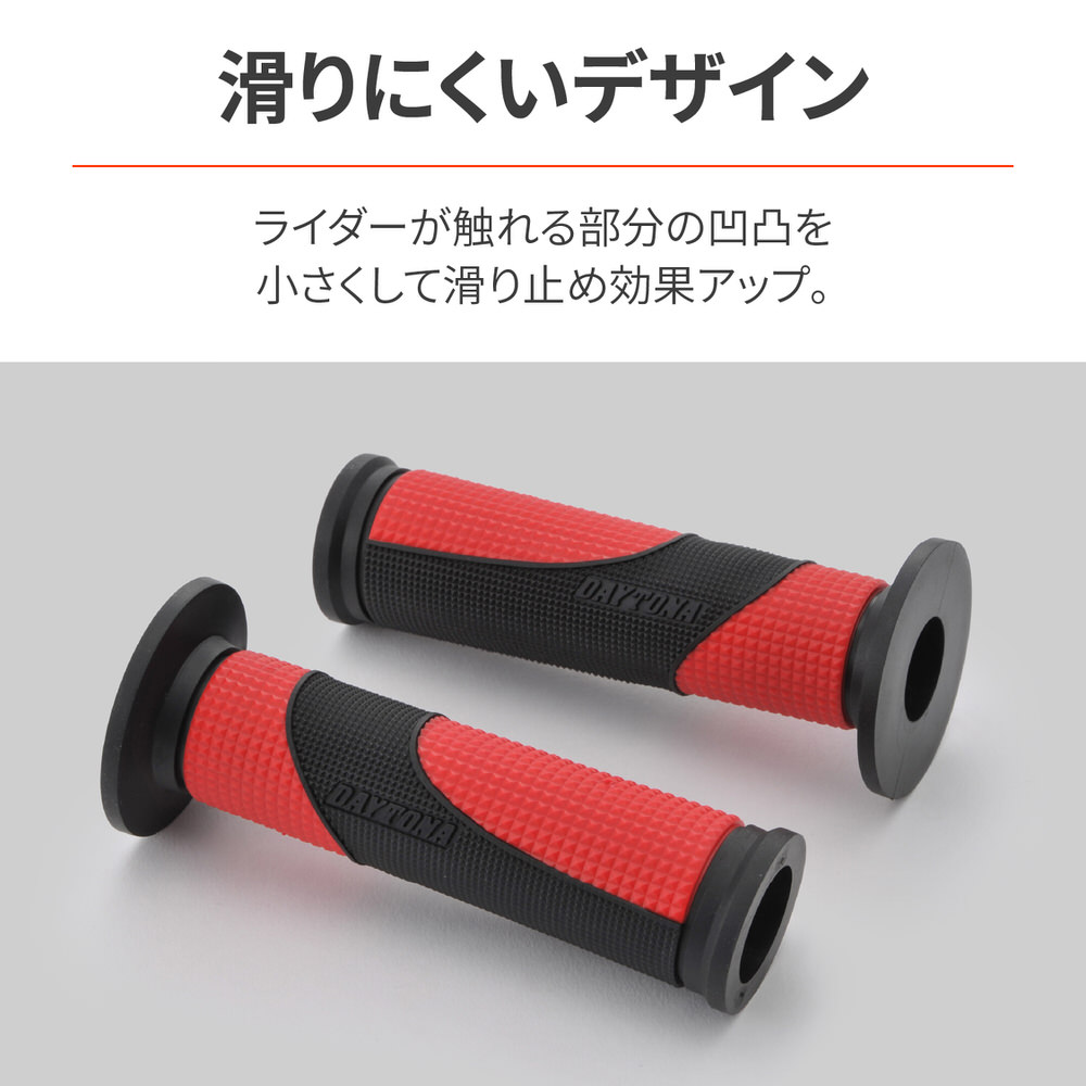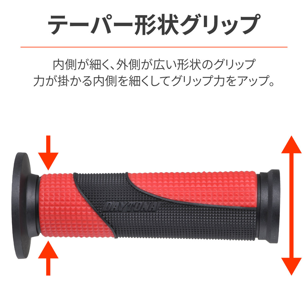 滑らないから疲れにくい、デイトナオリジナルグリップ。内側に向かって細くなるテーパー形状のグリップ。力の掛かる内側を細くしてグリップ力をアップ。ライダーが触れる部分の凹凸を小さくして滑り止め効果アップ。φ22.2mmハンドル用グリップグリップ長:122mm内側に向かって細くなるテーパー形状グリップエンド貫通タイプ※確実に取り付けるため、グリップボンドを使用してください。セーフティワイヤーを併用すると、より効果的です。※純正スロットルスリーブがリブ付構造の車両はリブを削ってください。