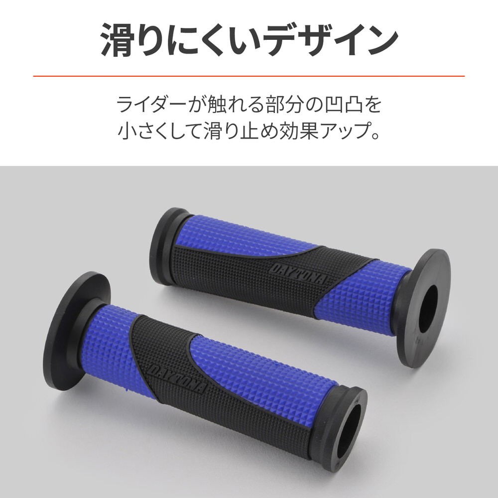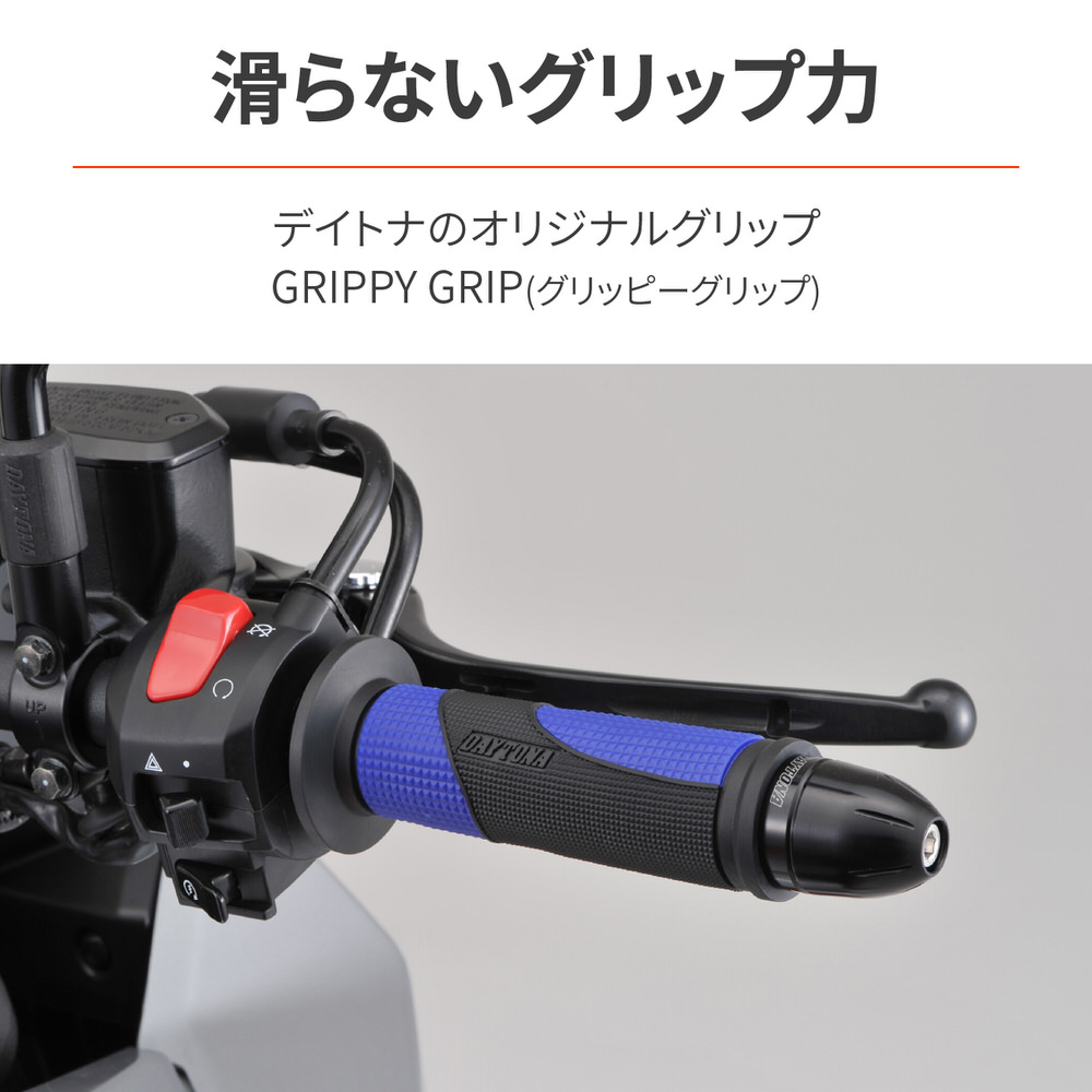 滑らないから疲れにくい、デイトナオリジナルグリップ。内側に向かって細くなるテーパー形状のグリップ。力の掛かる内側を細くしてグリップ力をアップ。ライダーが触れる部分の凹凸を小さくして滑り止め効果アップ。φ22.2mmハンドル用グリップグリップ長:122mm内側に向かって細くなるテーパー形状グリップエンド貫通タイプ※確実に取り付けるため、グリップボンドを使用してください。セーフティワイヤーを併用すると、より効果的です。※純正スロットルスリーブがリブ付構造の車両はリブを削ってください。