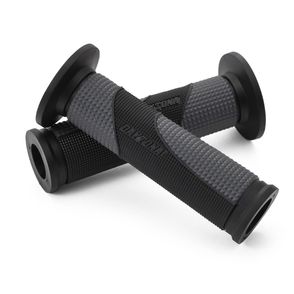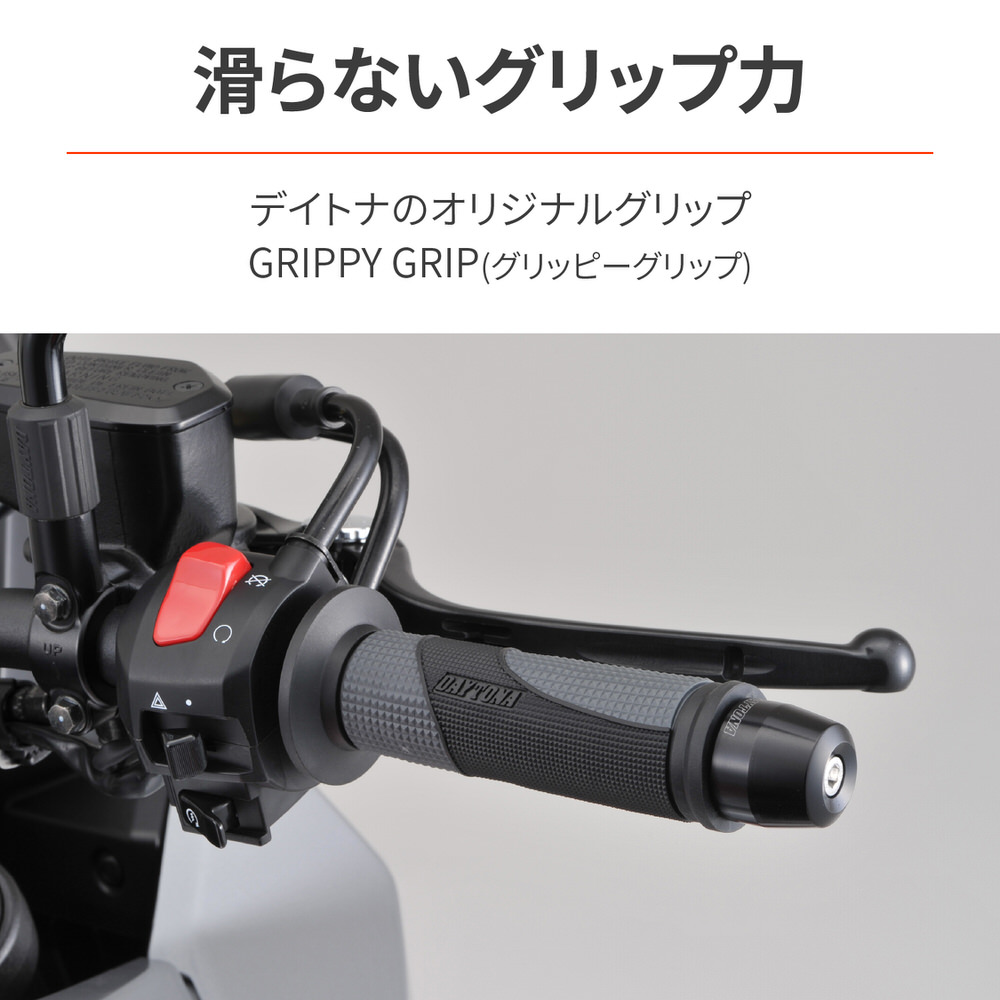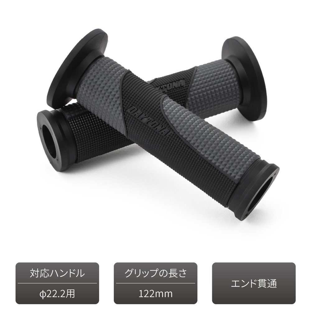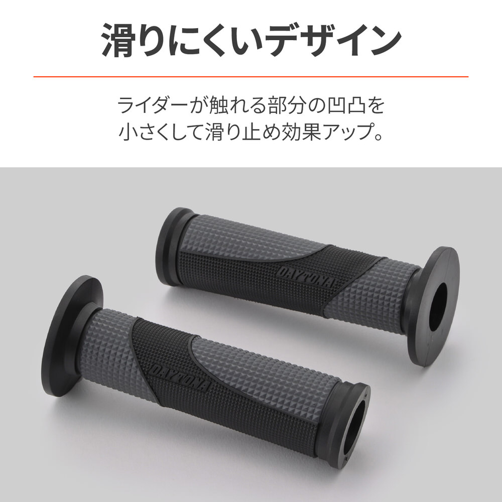滑らないから疲れにくい、デイトナオリジナルグリップ。内側に向かって細くなるテーパー形状のグリップ。力の掛かる内側を細くしてグリップ力をアップ。ライダーが触れる部分の凹凸を小さくして滑り止め効果アップ。φ22.2mmハンドル用グリップグリップ長:122mm内側に向かって細くなるテーパー形状グリップエンド貫通タイプ※確実に取り付けるため、グリップボンドを使用してください。セーフティワイヤーを併用すると、より効果的です。※純正スロットルスリーブがリブ付構造の車両はリブを削ってください。