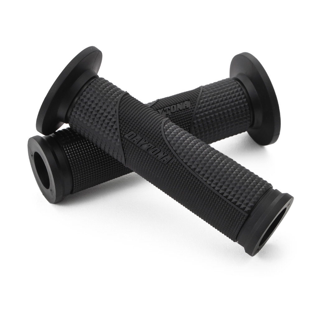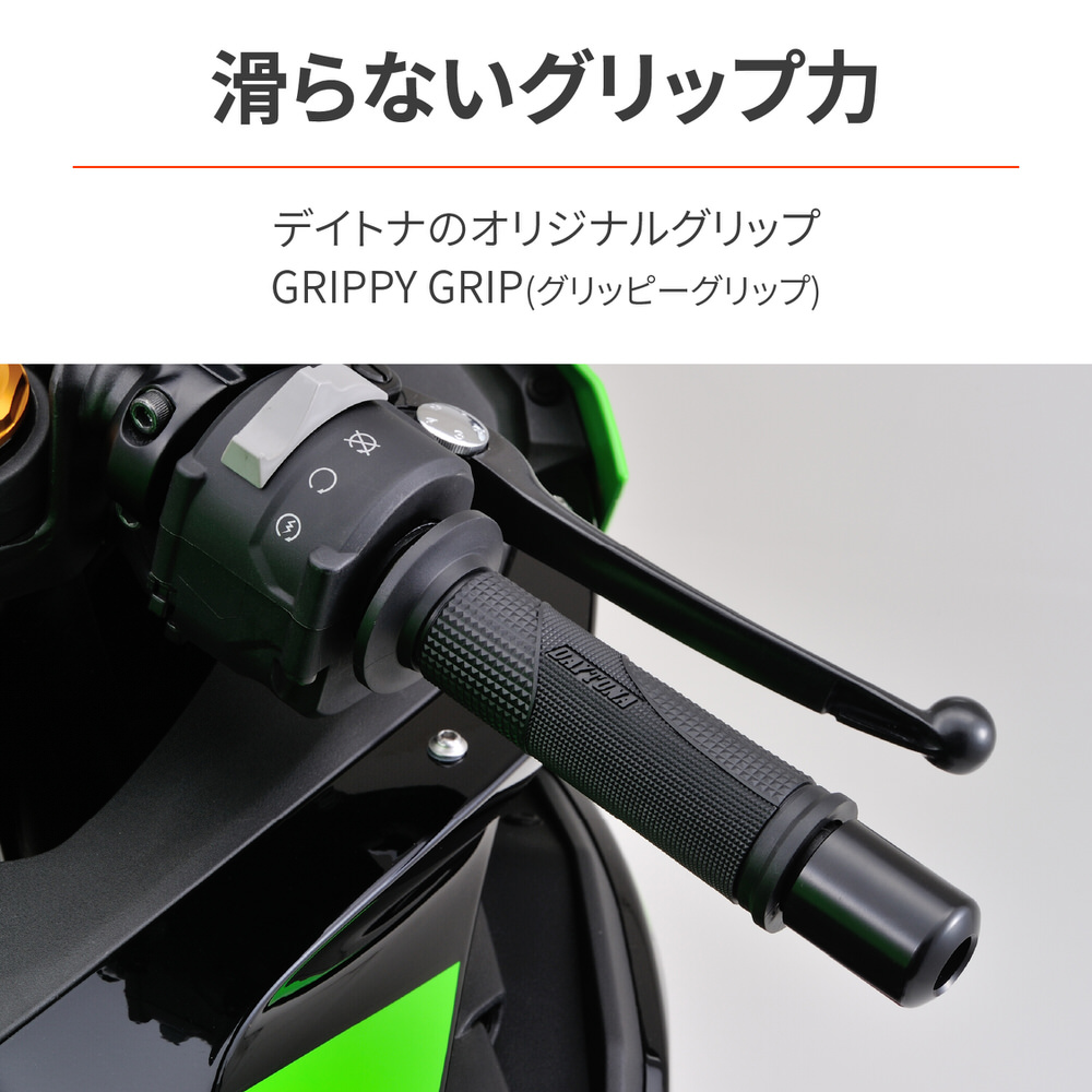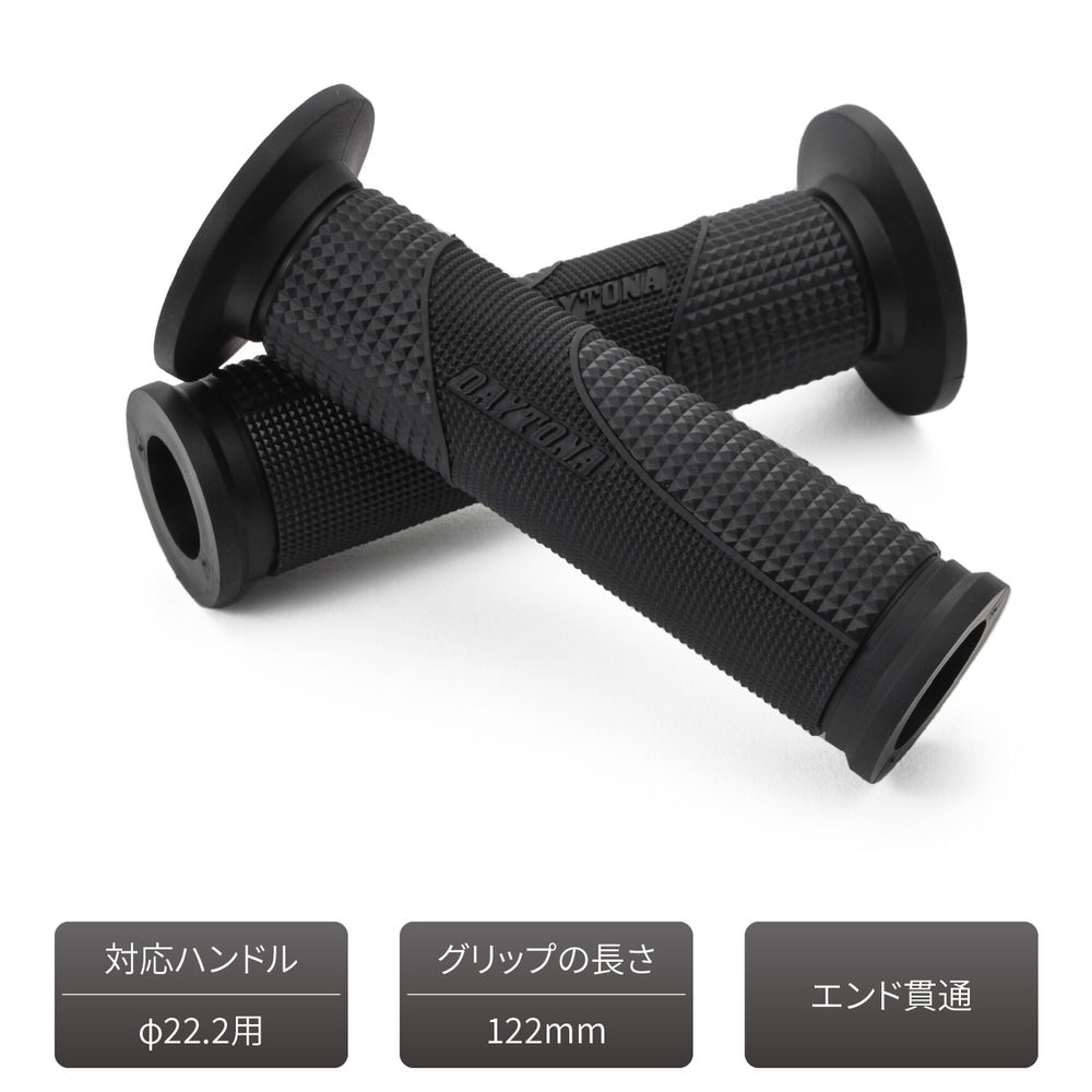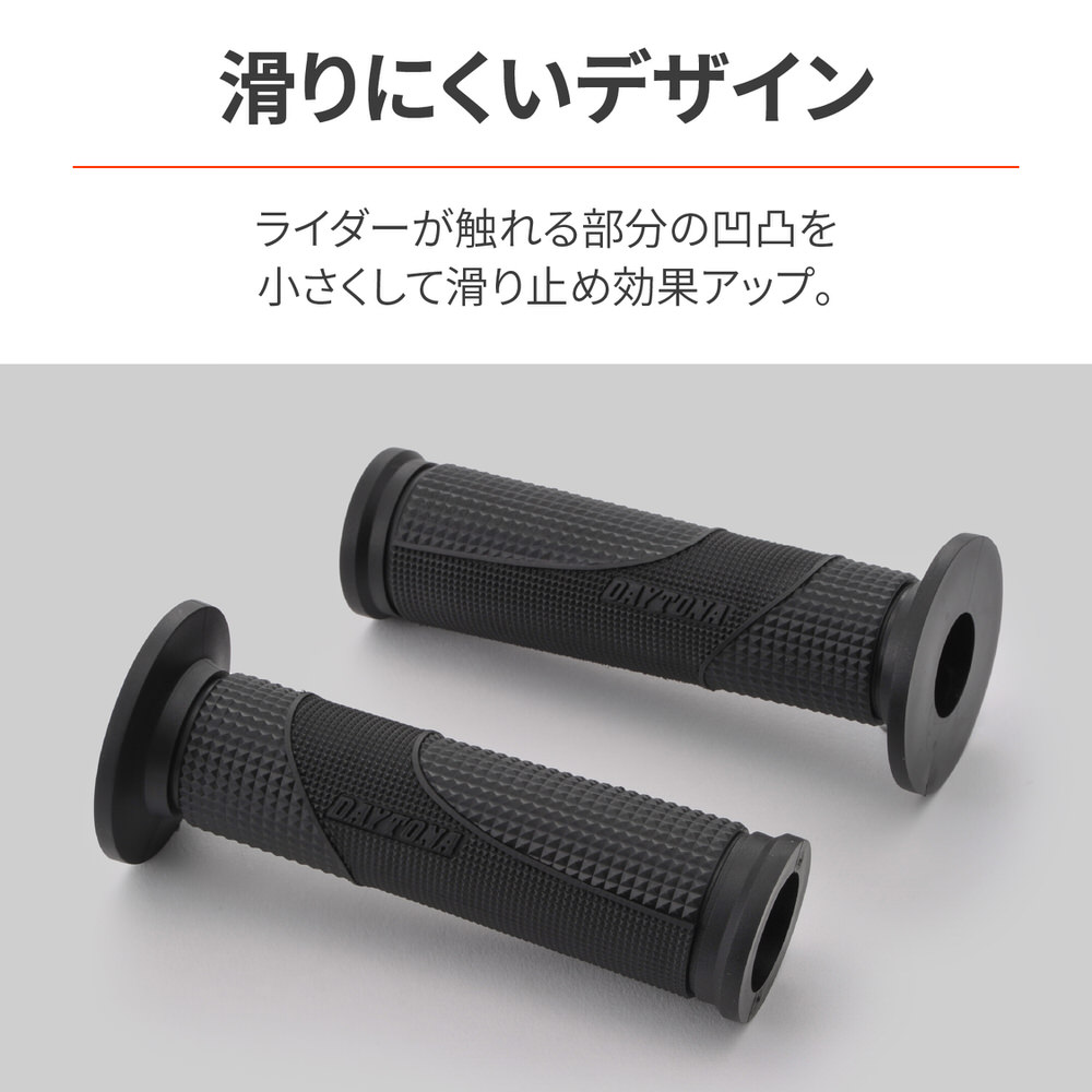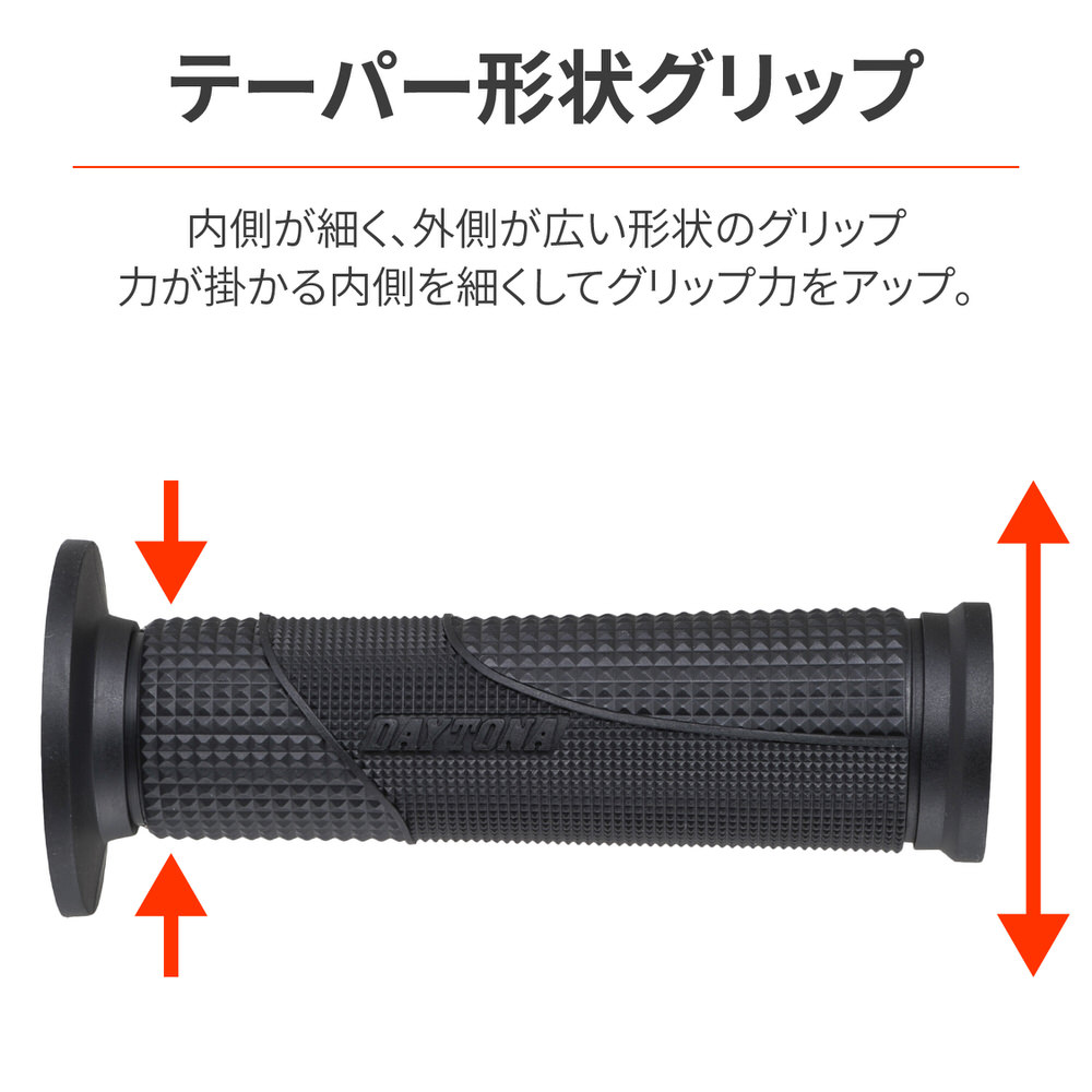 滑らないから疲れにくい、デイトナオリジナルグリップ。内側に向かって細くなるテーパー形状のグリップ。力の掛かる内側を細くしてグリップ力をアップ。ライダーが触れる部分の凹凸を小さくして滑り止め効果アップ。φ22.2mmハンドル用グリップグリップ長:122mm内側に向かって細くなるテーパー形状グリップエンド貫通タイプ※確実に取り付けるため、グリップボンドを使用してください。セーフティワイヤーを併用すると、より効果的です。※純正スロットルスリーブがリブ付構造の車両はリブを削ってください。