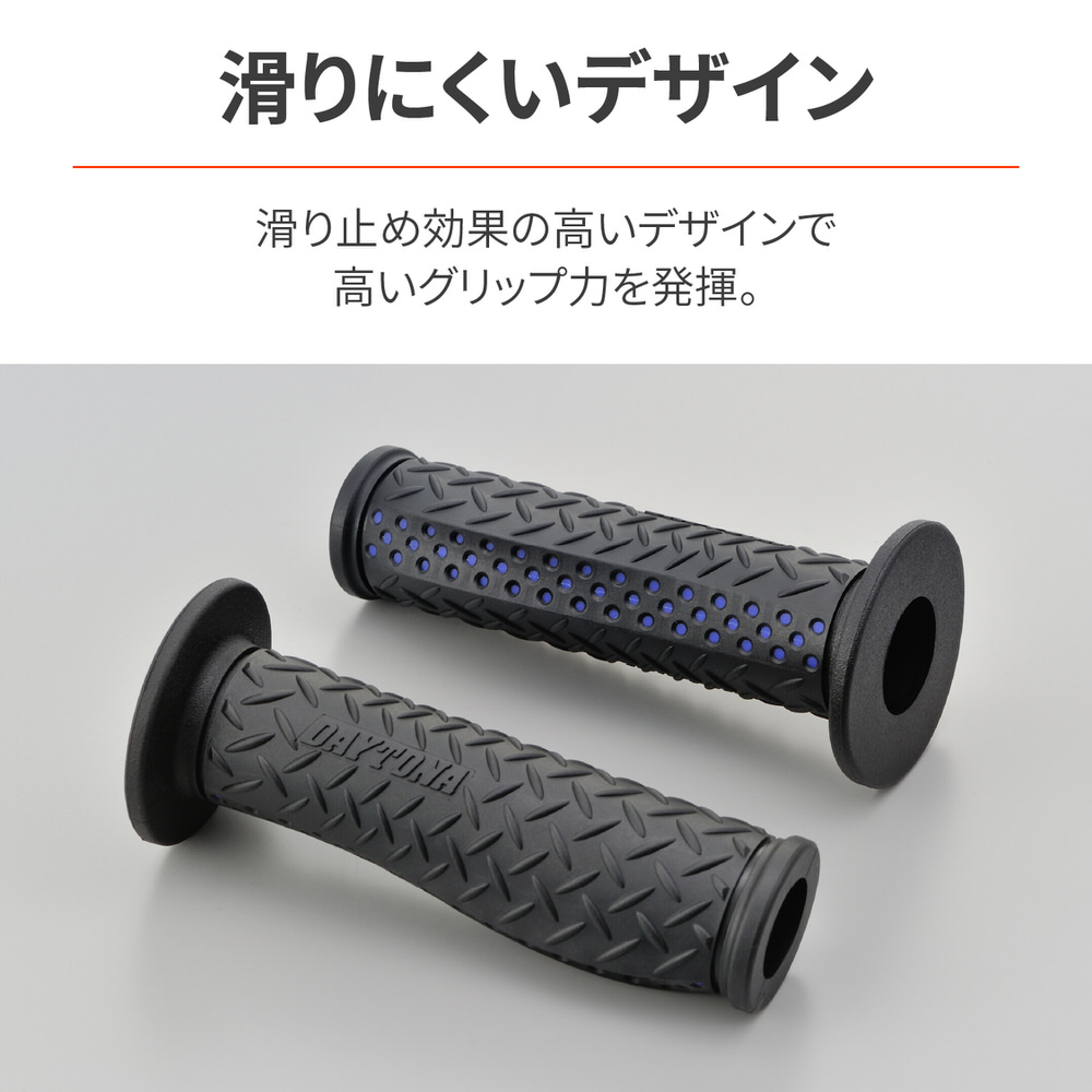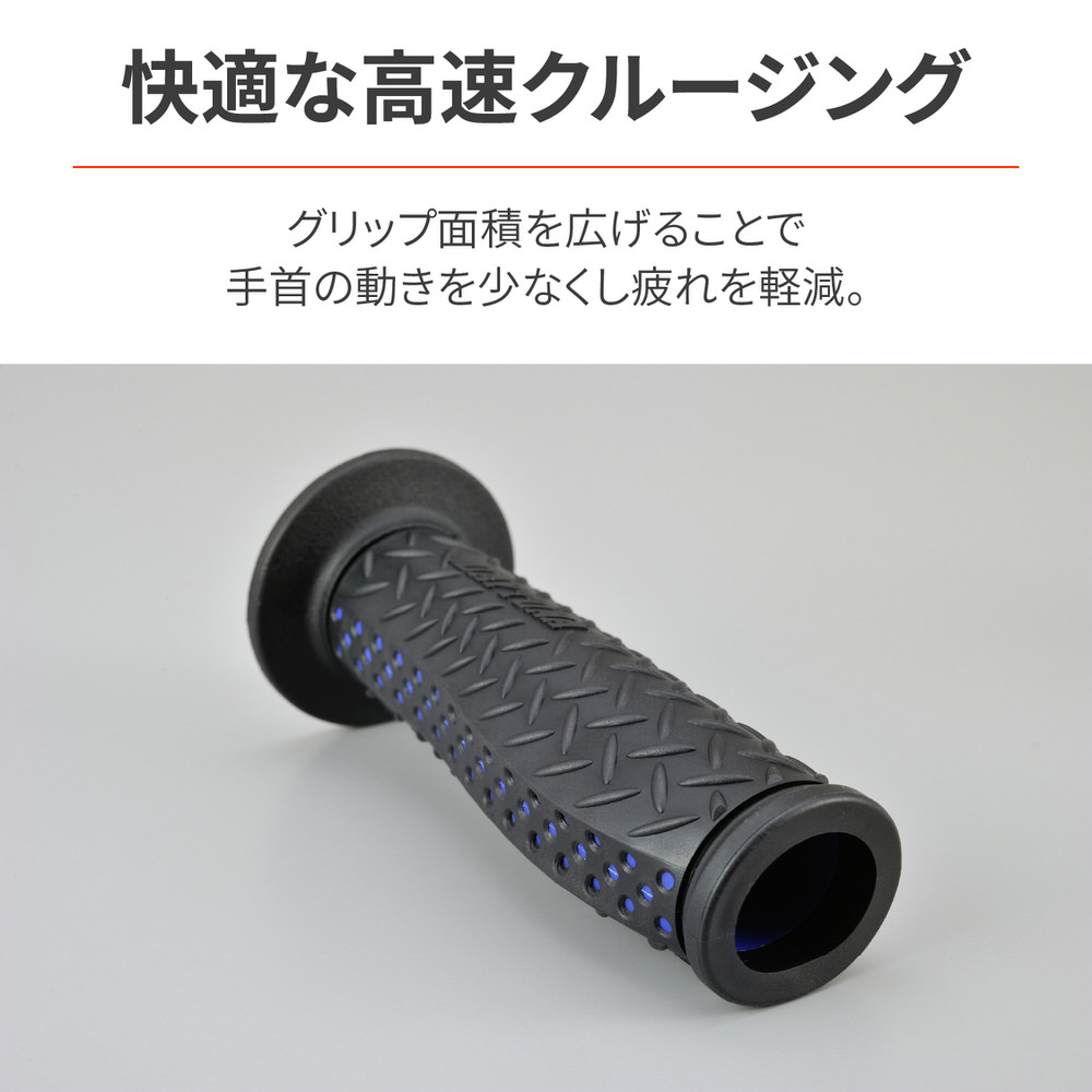 滑らないから疲れにくい、デイトナオリジナルグリップ。手の平の下側にあたる部分を広げることで、スロットル操作時の手首の動きを少なくし疲れを軽減。高速クルージングが快適になります。φ22.2mmハンドル用グリップグリップ長:122mmグリップ面積を広げ快適な高速クルージングエンド貫通タイプ※確実に取り付けるため、グリップボンドを使用してください。セーフティワイヤーを併用すると、より効果的です。※純正スロットルスリーブがリブ付構造の車両はリブを削ってください。