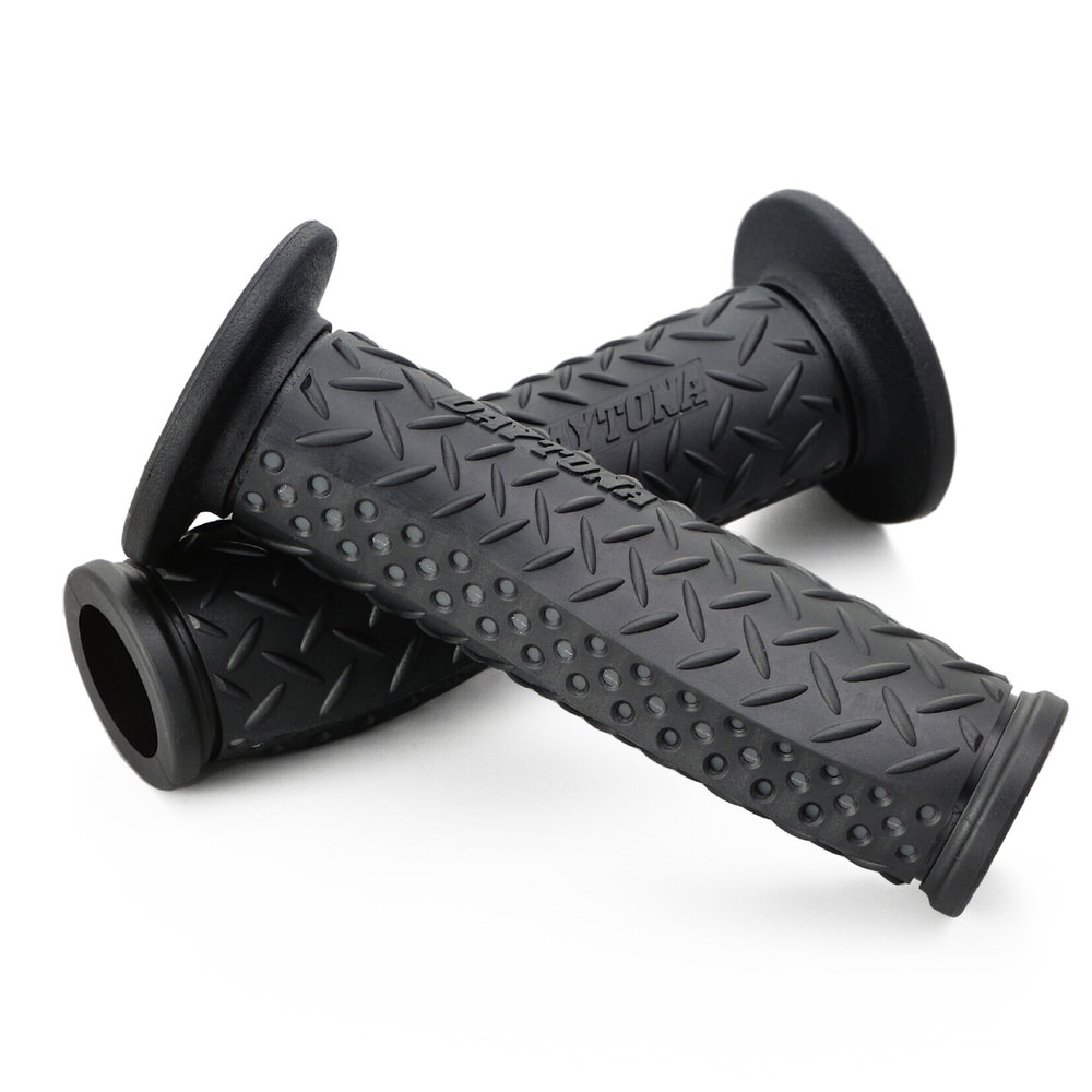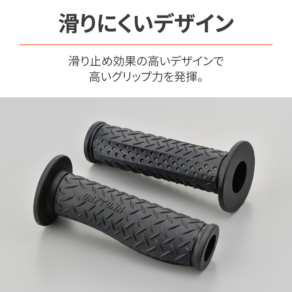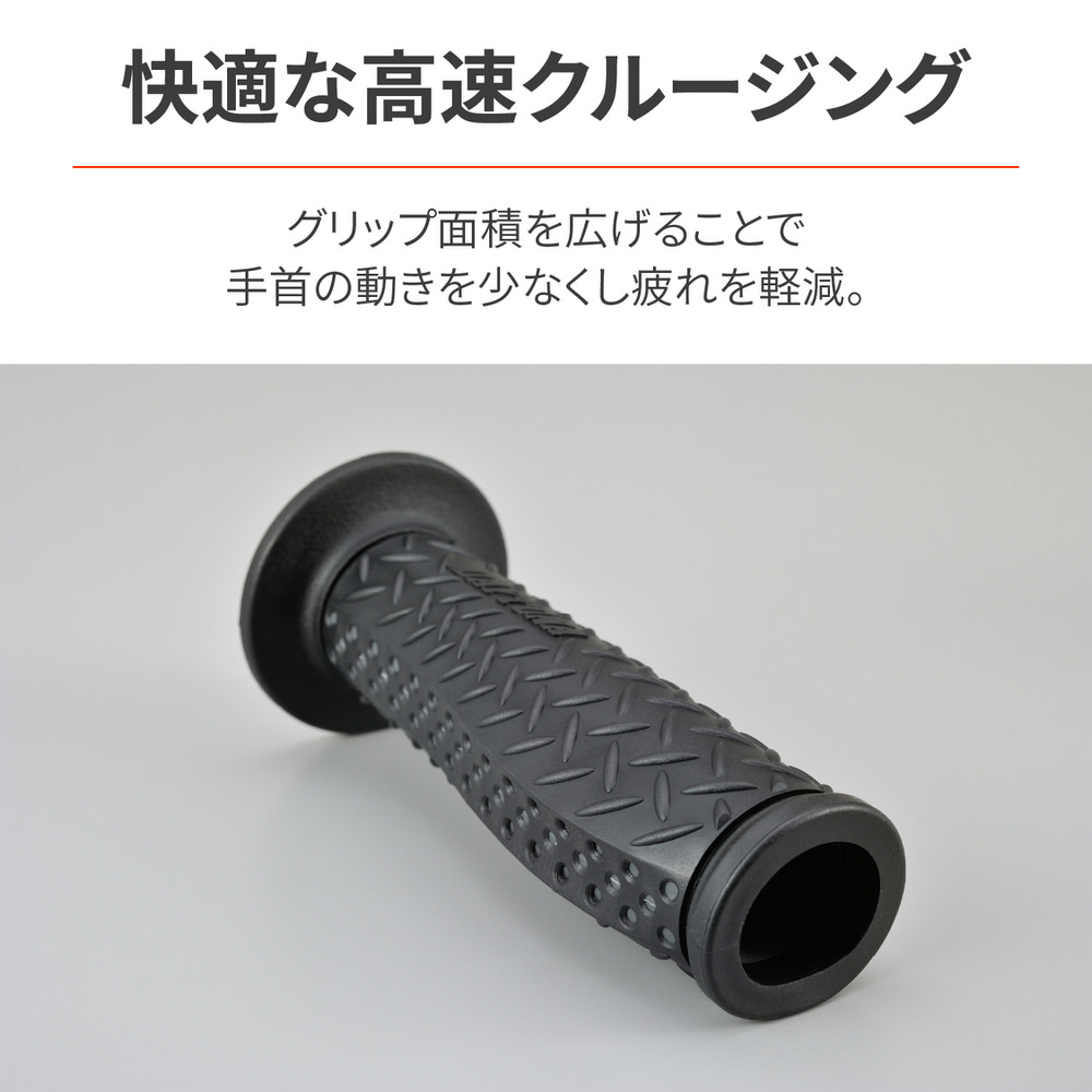 滑らないから疲れにくい、デイトナオリジナルグリップ。手の平の下側にあたる部分を広げることで、スロットル操作時の手首の動きを少なくし疲れを軽減。高速クルージングが快適になります。φ22.2mmハンドル用グリップグリップ長:122mmグリップ面積を広げ快適な高速クルージングエンド貫通タイプ※確実に取り付けるため、グリップボンドを使用してください。セーフティワイヤーを併用すると、より効果的です。※純正スロットルスリーブがリブ付構造の車両はリブを削ってください。