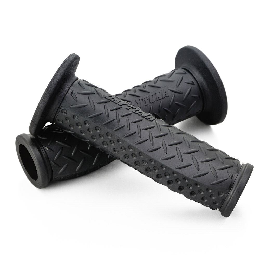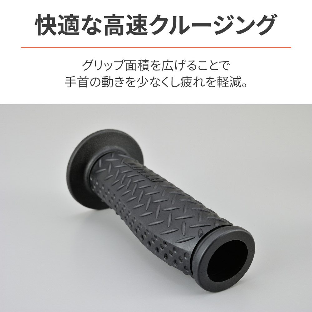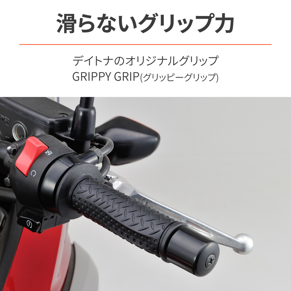 滑らないから疲れにくい、デイトナオリジナルグリップ。手の平の下側にあたる部分を広げることで、スロットル操作時の手首の動きを少なくし疲れを軽減。高速クルージングが快適になります。φ22.2mmハンドル用グリップグリップ長:122mmグリップ面積を広げ快適な高速クルージングエンド貫通タイプ※確実に取り付けるため、グリップボンドを使用してください。セーフティワイヤーを併用すると、より効果的です。※純正スロットルスリーブがリブ付構造の車両はリブを削ってください。