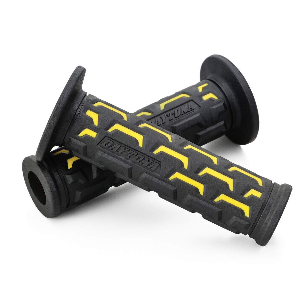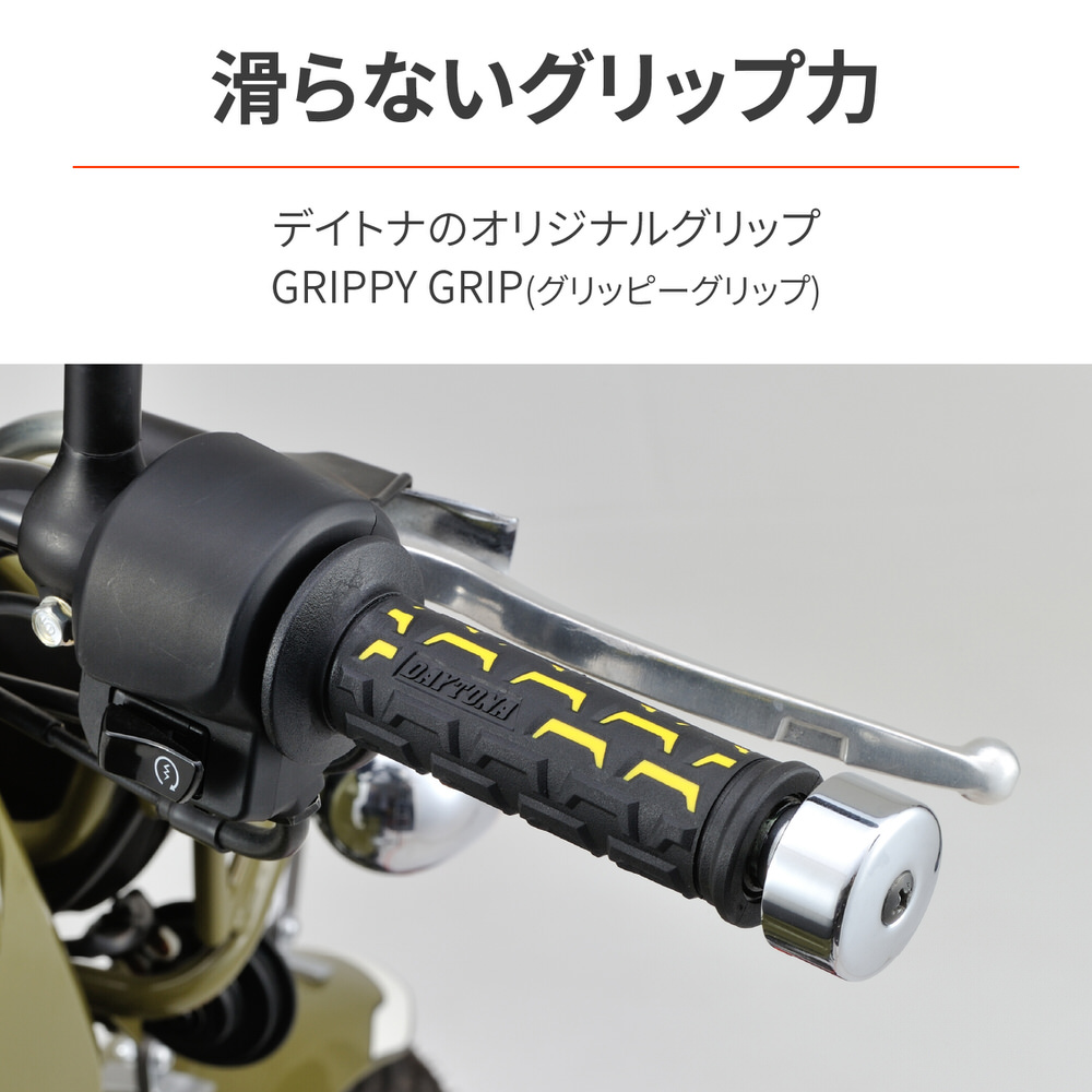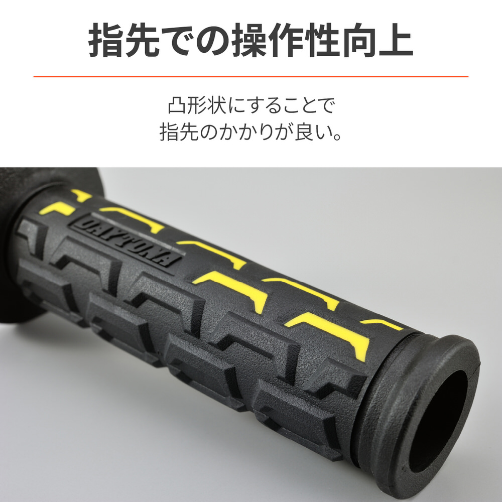 滑らないから疲れにくい、デイトナオリジナルグリップ。表面のパターンは土をかき出すイメージをデザイン。指先は凸形状にすることで指のかかりを良くし、指先でも操作しやすくしています。φ22.2mmハンドル用グリップグリップ長:122mm指先でも操作しやすい凸形状エンド貫通タイプ※確実に取り付けるため、グリップボンドを使用してください。セーフティワイヤーを併用すると、より効果的です。※純正スロットルスリーブがリブ付構造の車両はリブを削ってください。