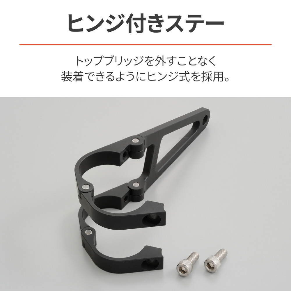 アルミ削り出しのヘッドライトブラケット。ヒンジ式でトップブリッジを取り外すことなく取り付けが可能。また、ヘッドライト幅はフレキシブルに対応可能。汎用ヘッドライトステーフロントフォークφ35mm用ヒンジ式で取付簡単アルミ製マットブラックアルマイト処理