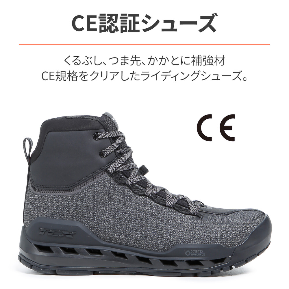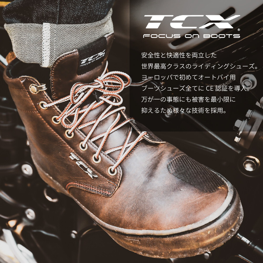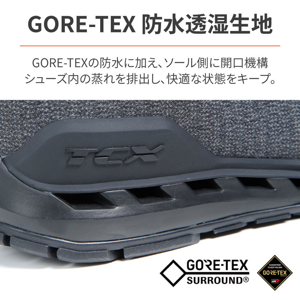 TCX1982年に軍隊向けブーツ工場としてイタリア北部のモンテベルーナで創業したTCX社は、1999年にオリジナルブランド「OXTAR(現在はTCX)」を立ち上げる。ライディングブーツとして世界で初めて国際特許を取得したT.C.S.(トーションコントロールシステム)を採用したレーシングブーツを発売。足首の動きを妨げずに"ケガ"から守るシステムは、レーシングブーツ界にイノベーションを起こし、瞬く間に世界中でシェアを獲得。安全性を常に最優先に考えるTCXは、ヨーロッパで初めて、オートバイ用ブーツシューズ全ての製品にCE認証を導入。現在でも数多くのライディングギアブランド(BMW、トライアンフ、ダイネーゼ、DUCATIなど)がOEMを依頼している信頼性の高いブランドです。アッパー:高靭性ファブリック(耐摩耗/耐引裂性)、合成皮革、リフレクター(かかとテープ部)プロテクション:補強材(くるぶし/つま先/かかと)コンフォート:GORE-TEX 防水透湿メンブレン / GORE-TEX SURROUND ベンチレーションアウトソール / EVAクッションミッドソール / OrthoLite インソール / 靴ひも固定用バンドアウトソール:groundtrax / トレッキングパターン