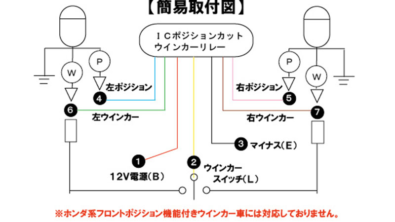 本製品はリレーの機能として電球・LEDバルブを問わず合計50WまでのDC(直流)回路に使用可能です。ポジションは、電球・LEDバルブを問わず合計20WまでのDC(直流)回路に使用可能です。ポジション機能は、ウインカー点滅指示が無い時は、フロントポジション(左右ランプ)を常時点灯状態にします。ウインカー指示操作した側のポジション灯を自動でカットし、ウインカー点滅動作が行われ、反対側は点灯した状態になります。※DC(直流)12V車の電球及びポジション機能付きLEDウインカー対応の製品となる為、ウインカー・ポジション・アース線の3芯タイプのウインカー専用となります。※ホンダ系のフロントポジション機能付きウインカー装着車には、対応しておりません。※ポジション点灯による発熱によりウインカーを溶かしてしまう可能性がございます。ご使用するウインカーのW数や発熱量を必ずご確認の上ご使用下さい。
