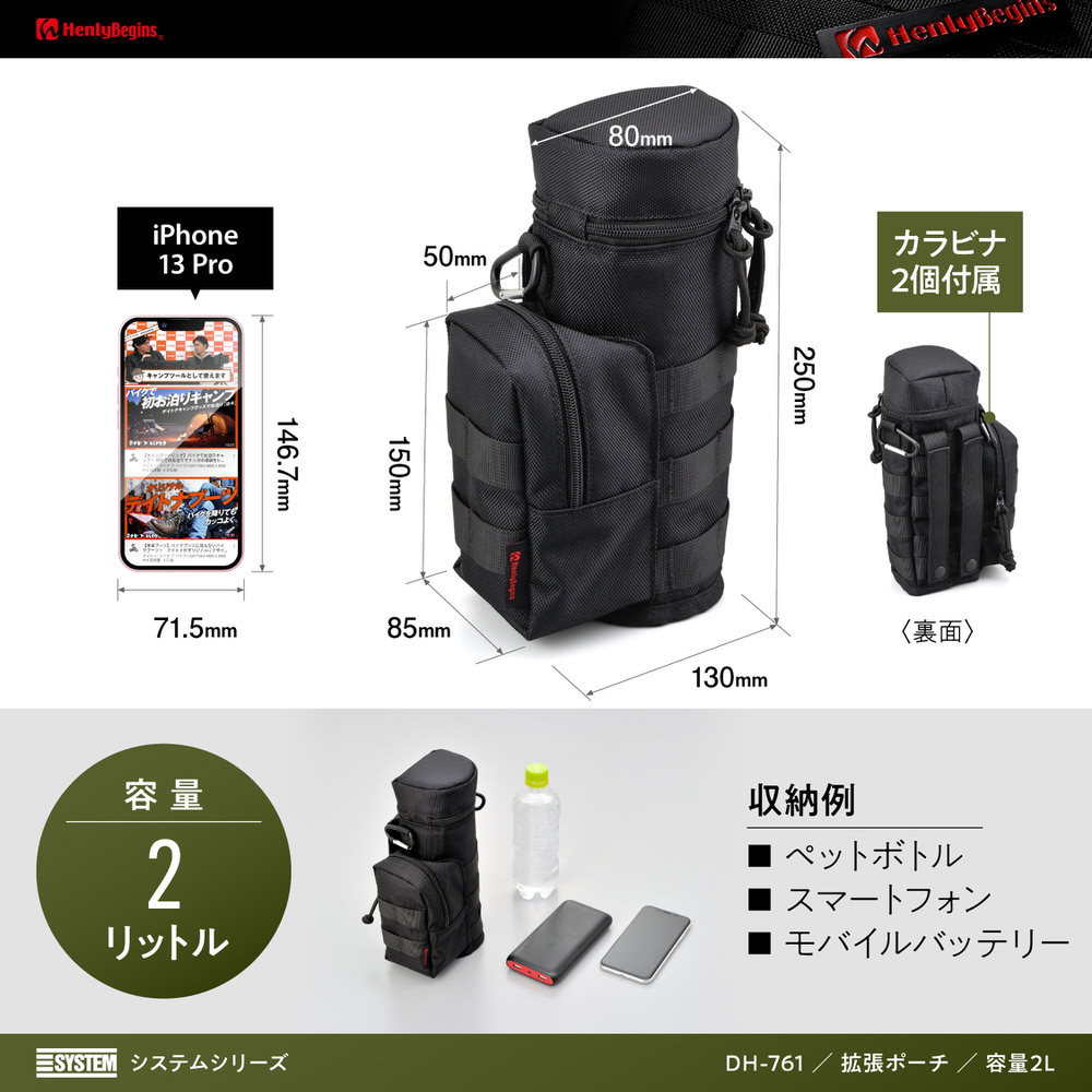 HenlyBeginsシートバッグSYSTEMに装着可能なポーチ。キャンプグッズのテーブル、椅子にも装着可能。【仕様1】別売のキャンプシートバッグDH-750と本品を自由に組み合わせて使用できる、新感覚のカスタマイズシステムバッグ【仕様2】容量:2L / ドリンクホルダー【仕様3】ドリンクホルダー:高さ250×幅80×奥行80mm / ポケット:高さ150×幅85×奥行50mm