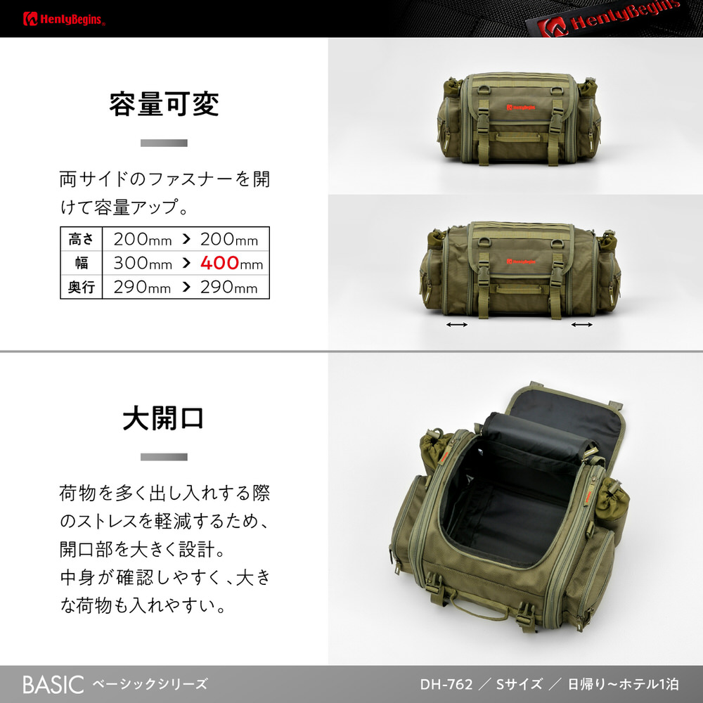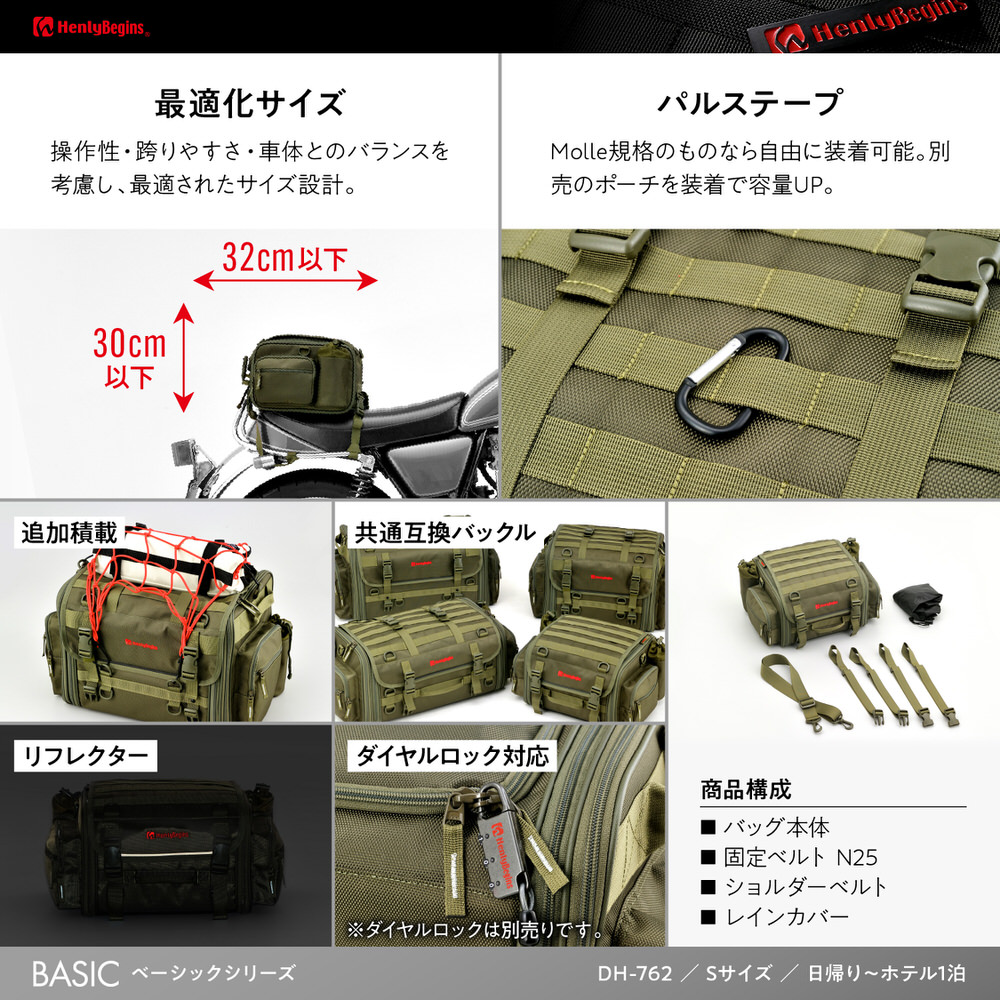 カタチが崩れない、だから使いやすい。3面パワーパネル×メタルフレームでシートバッグのカタチを維持。荷物が積みやすく、取り出しやすいBASICモデル。・両サイドのファスナーを開けて、容量アップ。・荷物を取り出しやすくするため、開口部を大きく設計。・3面パワーパネル×メタルフレームが荷物が少ない時でも型崩れを防止。・サイドポケット×2、ドリンクホルダー×2で小物収納も便利。・バイクの操作性・跨りやすさ・車体とのバランスを考慮したサイズ設計。・パルステープにより別売のポーチなど自由に装着可能。マルチに使える日帰り〜1泊サイズ容量:20-26L、最大積載重量:7kgバッグサイズ:高さ200×幅300-400×奥行290(mm)サイドポケットサイズ:高さ140×幅160×奥行40(mm)雨対策にレインカバー付属※イージーリングベルトはお使いいただけません。