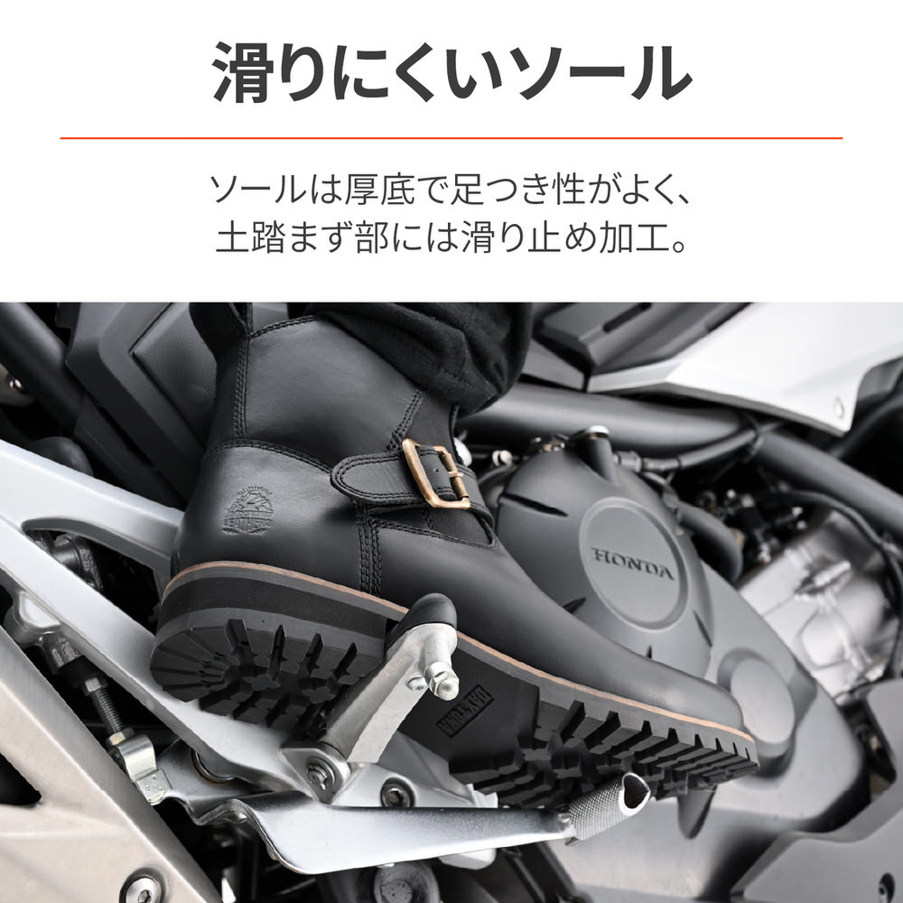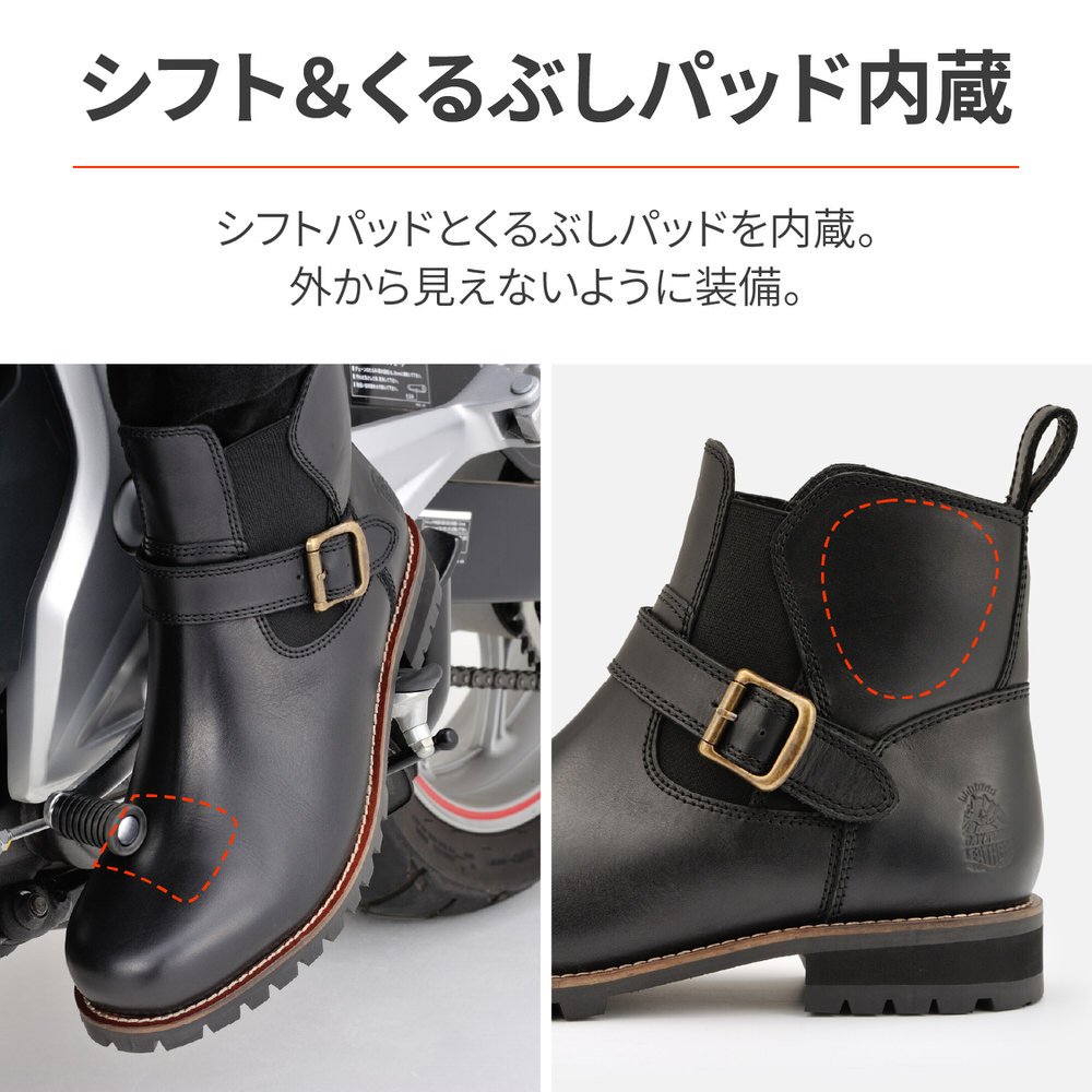スニーカー感覚で履けるライディングサイドゴアブーツ。ゴムを織り込んだ伸縮性が高い布"ゴア"を履き口の両サイドに施すことで、シューレースがなくてもしっかりフィットするサイドゴアブーツ。かかとのタブを引きながらサイドのゴムで容易に脱ぎ履きできます。アッパーレザーは、軽くて初めからすぐになじむので歩きやすい牛革を採用。中央のベルトは適度なフィット感に3段階の調節が可能。シフトパッドやくるぶしのクッションパッド、ソールの土踏まずには滑り止め加工など、ライディングブーツとして必要な機能を装備。パッドを内蔵することで外から見えないように装備。バイクから降りても違和感のない、お手軽に履けるライディング用ブーツです。教習所での指定要項である段付きのソール、ひもなし、くるぶし以上の丈といった要件を満たしています。ワイズ2E相当。軽くて初めからなじみやすい牛革を採用ゴア(伸縮性が高い布)を両サイドに施すことでスニーカー感覚で履けるシフトパッド、くるぶしパッドを外から見えないように内蔵土踏まず部に滑り止め加工教習所での指定要項をクリア(段付きのソール、ひもなし、くるぶし以上の丈)※防水機能はありません。
