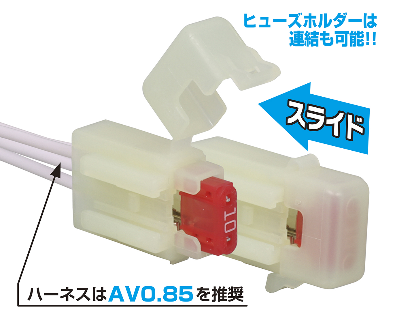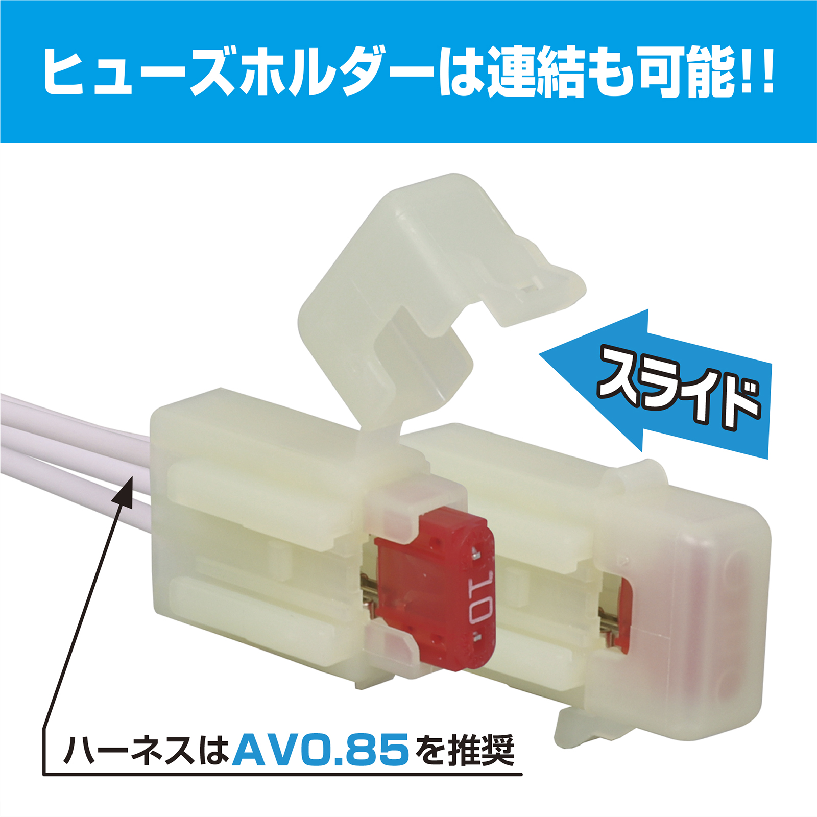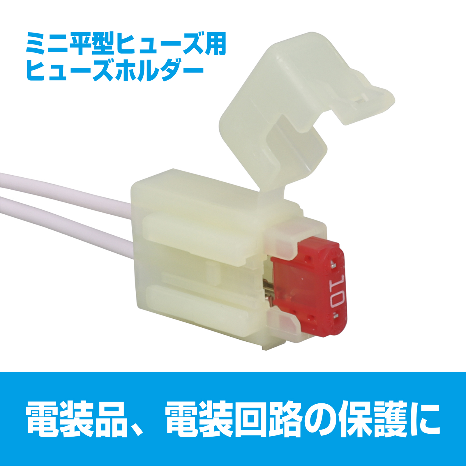 ミニ平型ヒューズ用ヒューズホルダーです。電装品、電装回路の保護にミニ平型ヒューズ用連結可能ハーネス:AV0.85推奨ミニ平型ヒューズ(10A×1)付属
