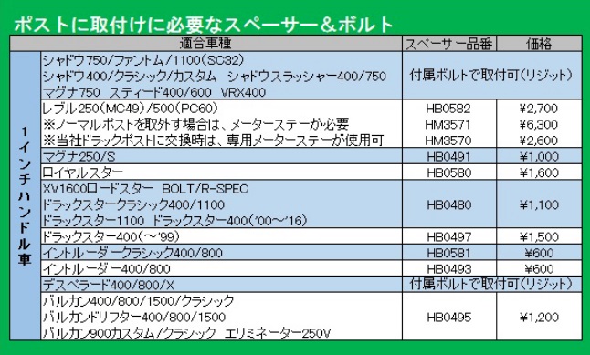 スチール製トリプルニッケルクロームメッキ4インチ 高さ110mmφ25.4mmハンドル用車種により別売スペーサーが必要(画像参照)適合車種シャドウACE(95-97 SC32)シャドウ750(97-15 RC44/50/56)シャドウスラッシャー750(00-04 RC48)シャドウファントム750(10-16 RC53)マグナ750/RS(93-98 RC43)スティード600/VLX(88-98)レブル500(PC60)(17-20 PC60)VRXロードスター(95-97 NC33)シャドウ400(97-08 NC34)シャドウカスタム400(09-16 NC45)シャドウクラシック400(09-16 NC44)シャドウスラッシャー400(00-08 NC40)スティード400/VLX/VCL/VSE/VLSマグナ250/S(94-07 MC29)レブル250(MC49)/S(17-22 MC49)XV1600ロードスター(99-01 VP12J)ロイヤルスター(96-99)ドラッグスター1100(99-08)ドラッグスタークラシック1100(00-08)ドラッグスター400(96-17)ドラッグスタークラシック400(98-17 4TR VH01/02J)イントルーダークラシック800(01-06 K1-K6)デスペラード800/X(97-99 VS53B)イントルーダー400(94-96)イントルーダー800(93-96)イントルーダークラシック400(01-16 VK54/56A)デスペラード400/X(96-00 VK52A)バルカン1500クラシック(96-99 VNT50D)バルカン1500ドリフター(99-02 VNT50J)バルカン900カスタム/クラシック(07-17 VN900B)バルカン800/クラシック/ドリフター(95-01)バルカン400/2/クラシック/ドリフター(95-03 VN400A/D)エリミネーター250V(98-07 VN250A)