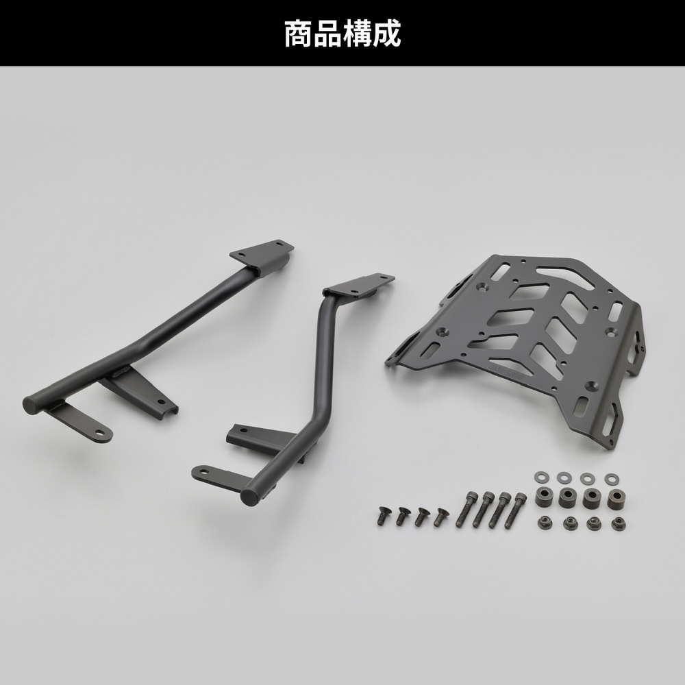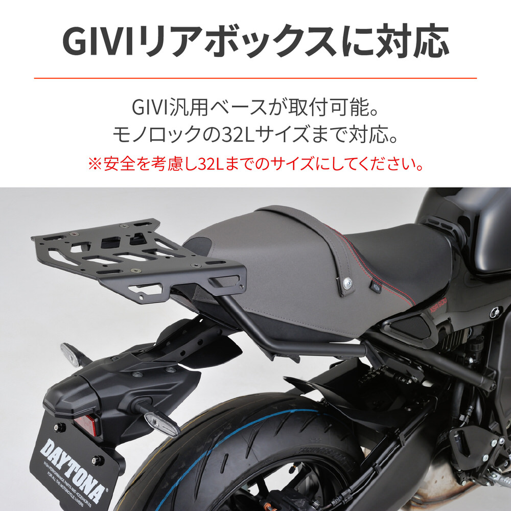 ドレスアップにもなるデザインキャリア。シートとキャリアのラインをできるだけ揃えることで、長い荷物や大きなバッグを安定して積載できます。32L以下のGIVIモノロックケースに対応。ツーリングネットを固定しやすくするために、4カ所に荷掛け穴を用意。GIVI汎用ベースが取付可能(モノロック32L以下に対応)メインパイプφ22.2最大積載重量:5kg※トップケース使用の際は安全を考慮し32L以下のサイズにしてください。
