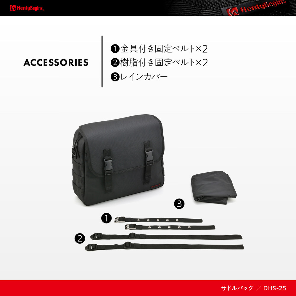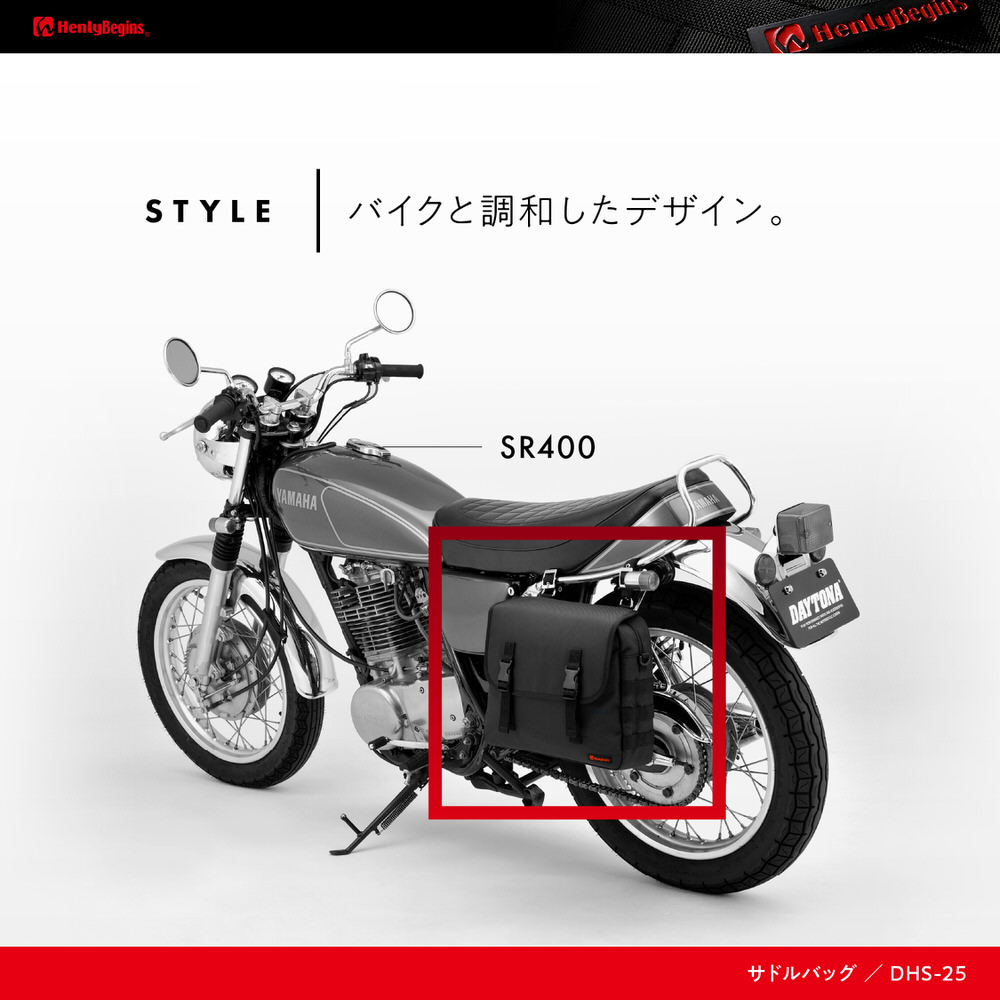 シートバッグにベストマッチしたサドルバッグ。HenlyBeginsツーリングシートバッグシリーズと同じ強度を持つ優れたポリエステル1680デニール生地を採用。フラップ、前面、側面の生地の間にウレタン芯を入れることにより型崩れしにくく、シートバッグと同時装着した際に統一感がある見た目になります。側面についているパルステープは幅を25mmにしてポーチを付けやすく、レインカバーはバッグに合わせて立体的に仕上げバタつきを抑えました。側面にはポーチなどの装着に使えるパルステープ付き。型崩れや巻き込み防止する補強板が標準装備。背面部をサドルバッグサポートに差込むことで走行時の振れを抑制。底面は熱に強い帆布生地。固定ベルトはデザイン性に優れた金具付きベルトと調整幅の広い樹脂部品付きベルトの2種類が付属。サドルバッグの形に合わせた立体形状のレインカバー付属。【用途】バイク用サドルバッグ【材質】シートバッグ同等のポリエステル1680デニール生地 / ウレタン芯を入れることで型崩れしにくい【仕様1】容量10L、最大積載重量2kg【仕様2】サイズ:縦280×横350×奥行100mm / サドルバッグサポート差込部有効幅:260mm【商品構成】レインカバー×1、金具付き固定ベルト×2、樹脂付き固定ベルト×2※取り付けには、別売のサドルバッグサポートまたは市販の巻き込み防止バーとの同時装着が必要です。※適合しないサポートがある場合がございます。あらかじめ、サドルバッグ背面にあるサポート差込部の寸法をご確認ください。