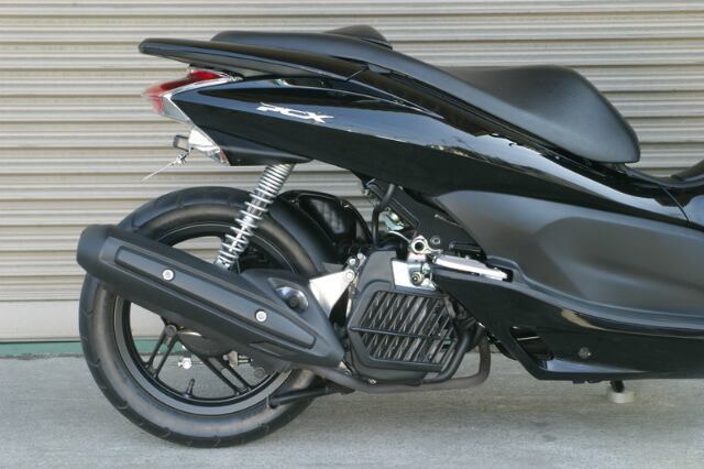 リアタイヤを後方へとオフセットし、ホイールベースをロング化するロングホイールベースキットです。HONDA PCXの1型モデル(125cc)対応です。ホイールベースを160mm延長し、安定感のあるグッドプロポーションを実現します。車両フレームにサブフレームを取り付ける方式で、エンジンハンガー自体は純正を使用。サブフレームもオーバースペックと言えるほどの高剛性、高耐久性を誇り、折れたり、曲がったりすることのない安心設計です。リアタイヤが後側へとオフセットされるために、純正のリアフェンダーが取り付けできません。リアフェンダーの加工や、社外品のナンバーステーをご使用ください。リアダンパーを社外品に交換している場合は、純正エアクリーナーが使用できなくなる場合があります。その場合は、社外品エアクリーナーをご使用ください。ハンドル交換をしている場合は、アクセルワイヤーが届かない場合もあります。その場合は、社外品のロングワイヤーに交換してください。