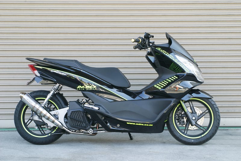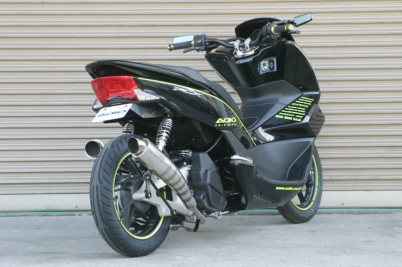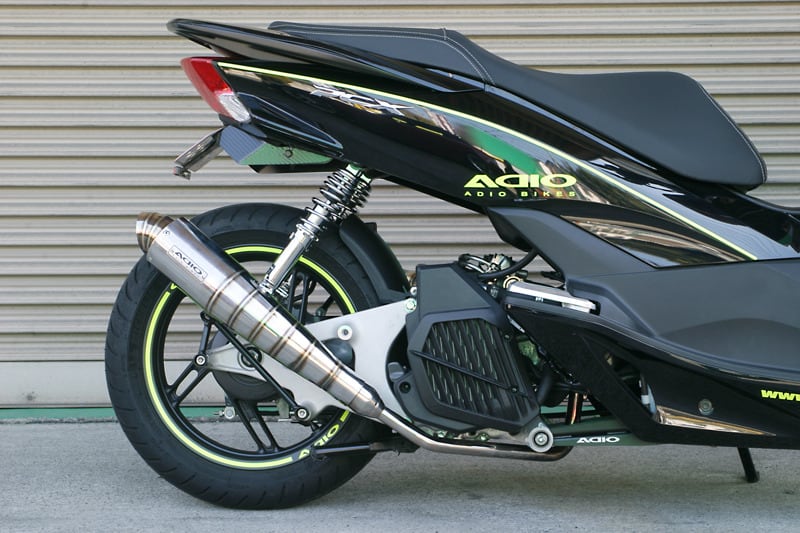 リアタイヤを後方へとオフセットし、ホイールベースをロング化するロングホイールベースキットです。PCX JF56/KF18(125cc/150cc)用は、110mmロングのキットは発売中ですが、新たに、より迫力のあるリアスタイルを実現する160mmロングのキットを開発しました。エンジンハンガーもオーバースペックと言えるほどの高剛性、高耐久性を誇り、折れたり、曲がったりすることのない安心設計です。ホイールベースを160mmロング化し、迫力のスタイルの両立を実現しました。エンジンハンガーは、独自のH断面構造とし、左右非対称デザインのステーにより、曲がり強度も向上させています。ブレーキワイヤー、アクセルワイヤー、燃料ホースは取り回しの変更、電源ハーネスは延長ハーネスをキットに付属しています。ホイールベースが長くなっても、剛性感のある安定した走りが可能です。車両が1クラス大きくなったような迫力のスタイルを実現します。ホイールベースをロング化すると、リアダンパーが極端に寝てしまい、リアダンパーへの負担が増してしまいます。また車高も極端に下がってしまい、走行性能にも影響します。そういった問題点を解消するために、リアダンパーを後側へとオフセットさせるブラケットも標準で付属しています。このブラケットを取り付けることにより、車高もノーマルと同等、エンジンヘッドも下がらないために、焼きつき等のトラブルにも安心です。純正エアクリーナーは使用できません。リアタイヤが後側へとオフセットされるために、純正のリアフェンダーが 取り付けできません。リアフェンダーの加工、またはアディオ製のフェンダーレスキット(別売)をご使用ください。純正エアクリーナーは取り付けできなくなります。アディオ製BB-SHOOTエアクリーナー(別売)や社外品のエアクリーナーをご使用ください。シートボックスの一部をカットし穴を開ける加工が必要です。開けた穴を塞ぐカバーが標準で付属しています。