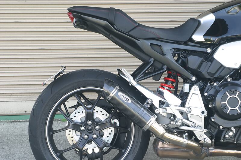 CB1000Rは、新しいCB-Rシリーズの特徴であるマスの集中化を図ったストファイ的なデザインが特徴です。ナンバープレートの位置もスイングアームにマウントするプロアームを採用。しかし、リアフェンダーは少し重い雰囲気。このリアフェンダーを取り外し、ナンバープレートのみとしたフェンダーレスキットです。ナンバー灯やリフレクターなど塊感の強いフェンダーを外し、スッキリとシンプルに、ストファイ感をより一層強くしました。塊感の強い純正リアフェンダー。これを取り外し、ナンバープレートとリフレクターステーのみのシンプルな構成としました。またナンバープレートの位置も少し上方へと移動させ、より一層のアグレッシブさを強調しました。ナンバーステーは、12mmのシャフトを使用し、片持ちでも抜群の剛性感があります。LEDナンバー灯とスリムリフレクターも付属。ストリートファイター的な獰猛さと、シンプルな軽快感を両立させています。ナンバーステーは、シンプルな12mmシャフトによるトラス構造。左サイドから見た場合も、ステー自体は主張し過ぎずに、車両のシルエットに違和感を与えません。リアタイヤをより強調させ、ストリートファイター的なアグレッシブさを演出しています。またシャフトの曲げ加工、補強としてのトラス構造は、レーシーそのもの。ワンオフ的なカスタム感をアピールできます。・LEDナンバー灯を取り付けるにあたり、配線加工が必要です。・ナンバープレートが共振してビビリ音がでる場合があります。その場合は、防振ゴムを貼るなどの対応が必要です。