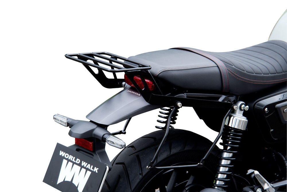 製品仕様カラー:ブラック材質:キャリア・バッグサポート本体 スチール/ボルト ステンレス/カラーセット内容(付属品):キャリア/バッグサポート(1本)/取付ボルト類/取扱説明書スタンダードモデルのGB350と比べ、よりスポーティーなモデルのGB350S。※※本品はキャリアとバッグサポート(1本)とのセット商品となります。【キャリアについて】純正シートでも比較的積載しやすい形状ですが、リアキャリアの装着により大幅な積載アップが可能です。シートに対し出来る限りフラットなキャリア形状となっているため、長い荷物の積載は勿論、大きめのツーリングバッグをシートとキャリア両方に乗せるという使い方も可能です。ワールドウォーク製の専用のバッグサポートとの併用可能シンプルな形状にスチール製の丸棒を組み合わせたシンプルな設計にこだわり、 細身のフレームやサイドのプレートの軽量化を図りました。 剛性を保ちながらも余計な負荷が掛かりにくいシンプルな形状に仕上げました。シートの延長となる設計シートと出来る限り高さを揃え、シートの延長となる設計となっております。大きめのツーリングバッグや長い荷物も積載しやすい形状に仕上げました。バッグの半分をリアキャリアに、半分をシートに載せる事も可能です。キャリアを装着する事でタンデム時の積載も可能となります。剛性を確保した強度のあるスチール製材質は強靭なスチール製。最大積載量は5Kgと、大型のリアボックスも積載可能です。※デザイン・仕様は予告なく変更されることがございます。予めご了承ください。※ご自身でお取り付けを行った場合はいかなる場合も補償の対象外となります。ご理解頂きますようお願い申し上げます。