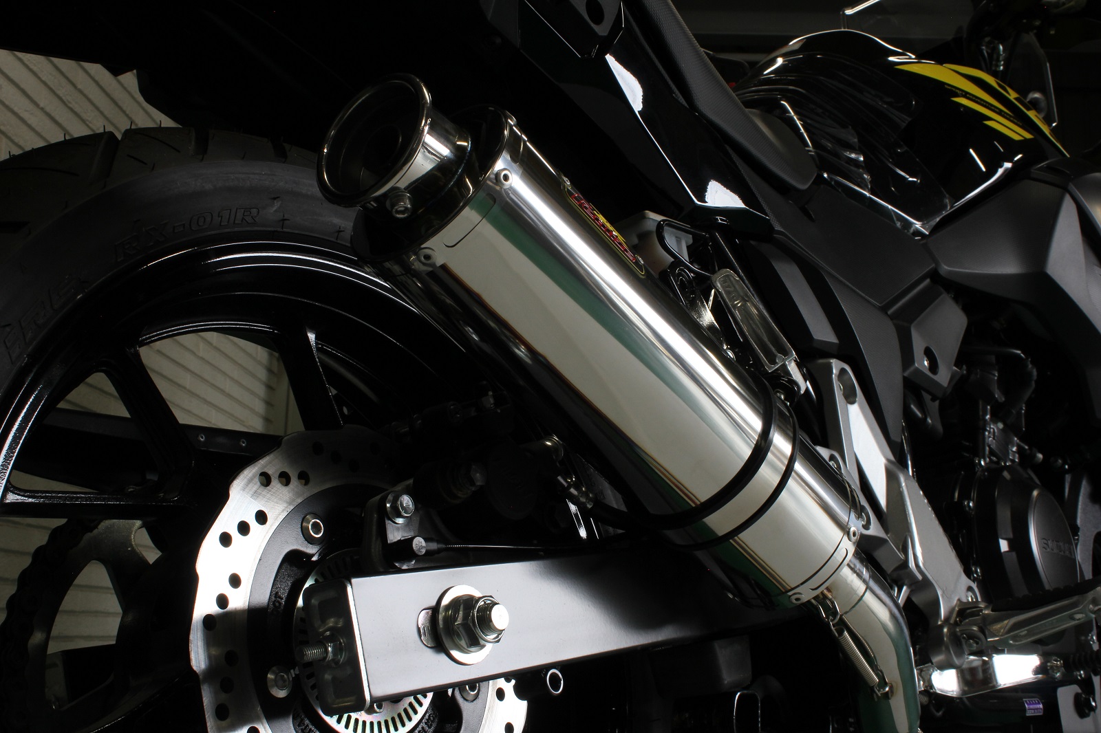 純正マフラーにセンタースタンドストッパーがついている仕様になっておりますので、マフラーを交換する際に付属品のセンタースタンドストッパを両面テープでスイングアーム部分に装着してください。
