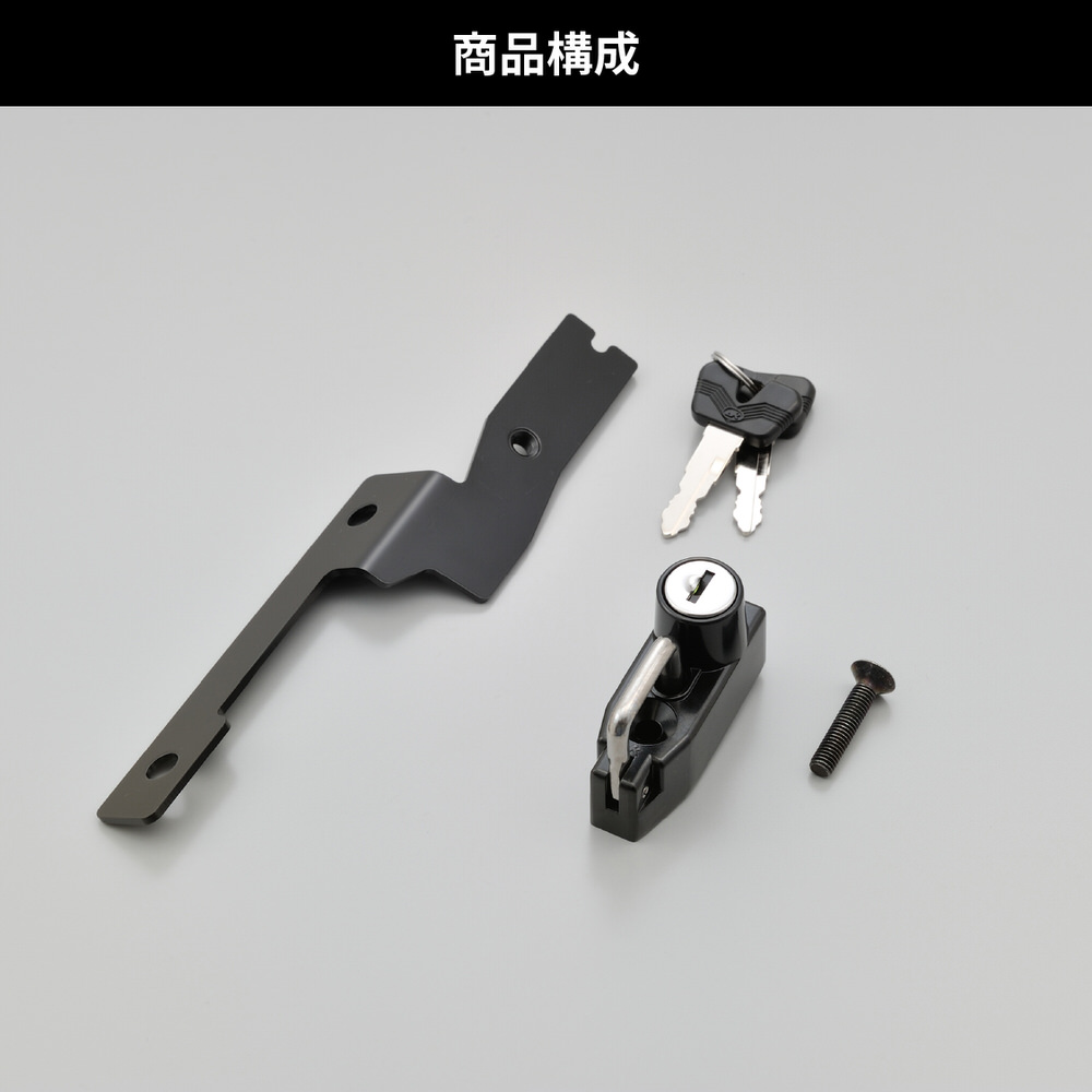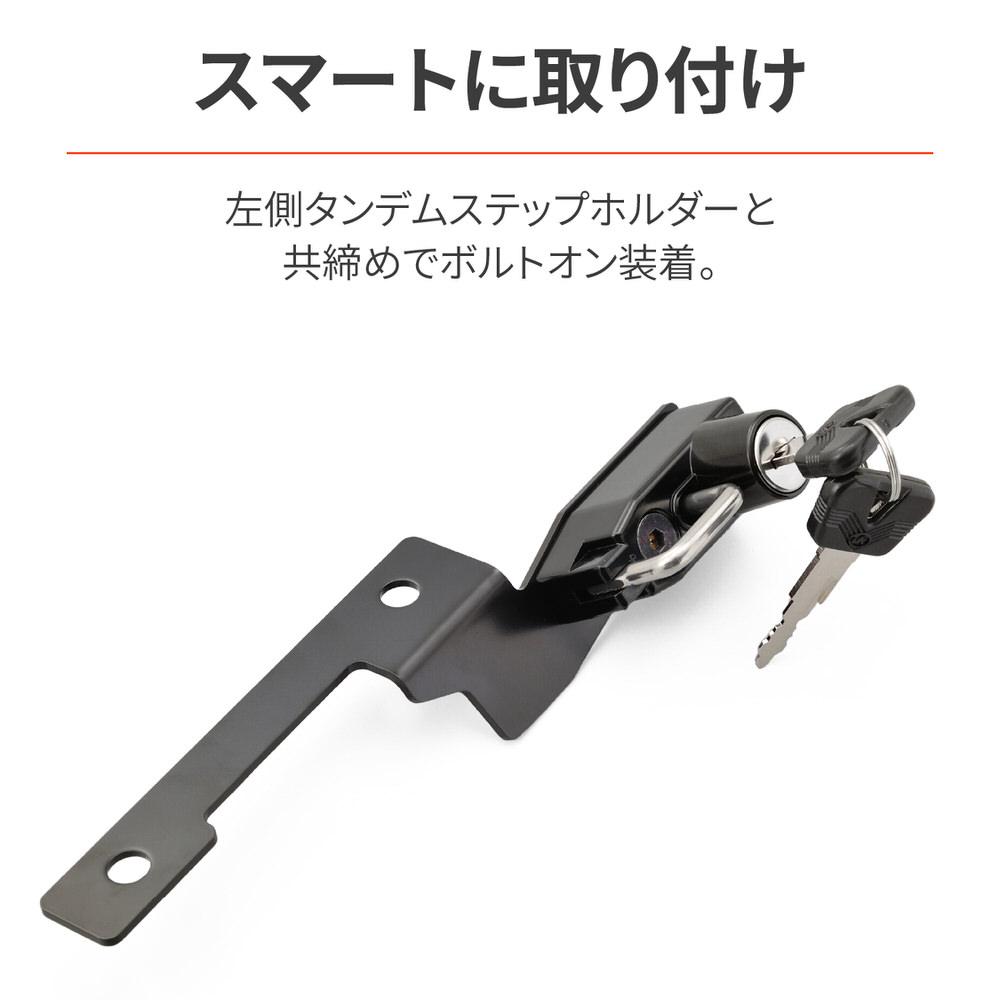 スマートに取り付けが可能な車種専用設計。純正ライクな見た目で、車両の雰囲気を崩しません。ヘルメットホルダーが標準装備されていない車両にボルトオンでヘルメットホルダーが取付可能。左側タンデムステップホルダーと共締めで簡単装着。カギは2本付属。純正のような見た目で車両の雰囲気を崩さない左側タンデムステップホルダーと共締めで簡単装着※駐車中のヘルメットの盗難を抑止する商品です。ホルダーにヘルメットを装着したままの走行は危険ですのでお止めください。※この商品は盗難やイタズラを抑止するものであり、完全な盗難防止を保証するものではありません。※この商品に装着した物の盗難、紛失、破損、故障に関しましては一切保証いたしかねます。あらかじめご了承ください。※カギのみの補修設定はありませんので、カギの紛失にはご注意ください。(カギ2本付属)