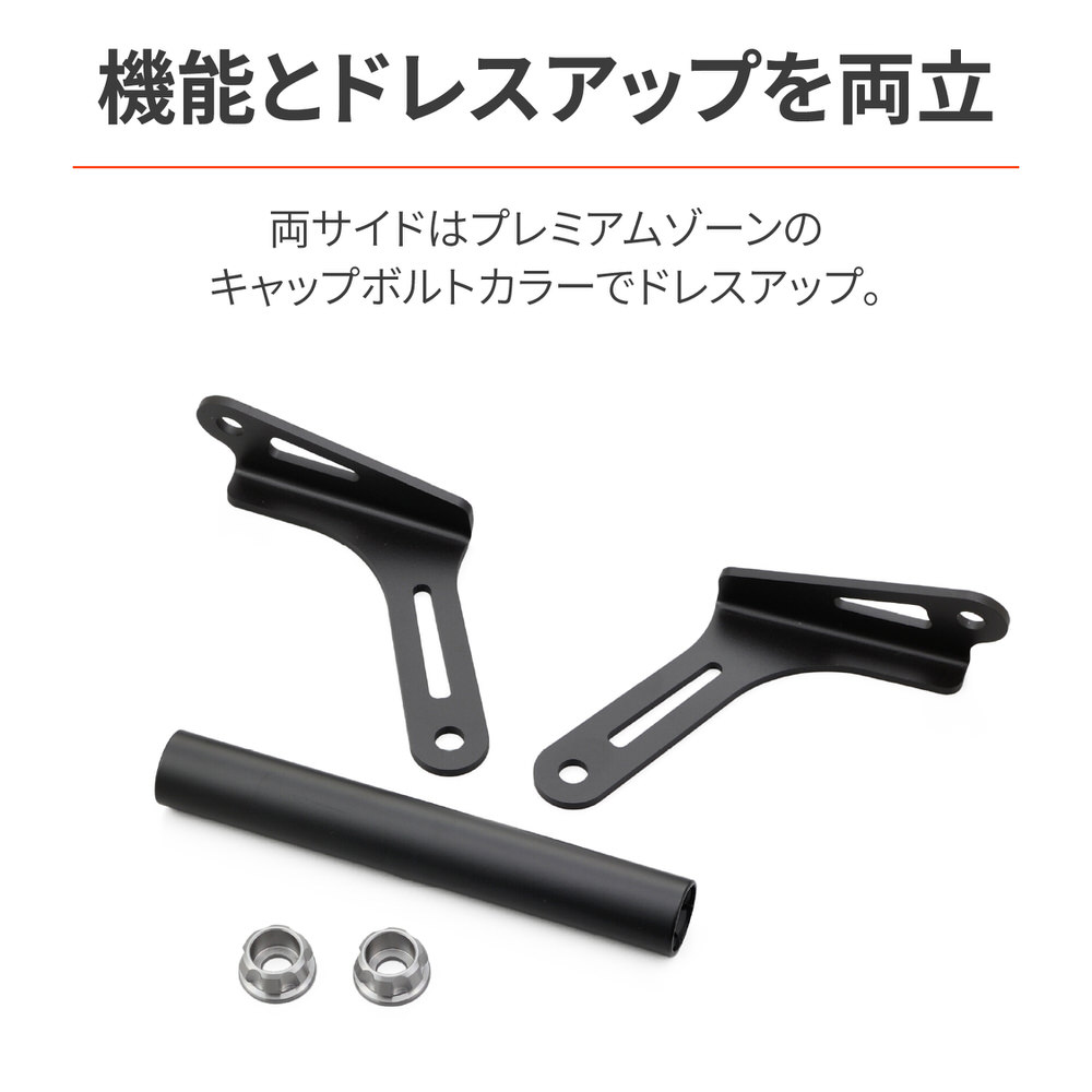車種専用のバーホルダー。車種別専用設計なので電子機器を見やすく、スマートに取付可能。分割式なので、通すタイプのクランプにも対応。両サイドにPREMIUM ZONEキャップボルトカラーM8を装備し、機能面とドレスアップを両立。別途キャップボルトカラーM8を購入すれば、好きな色にカスタムも可能。バー有効長100mm / パイプ径φ22.2PREMIUM ZONEキャップボルトカラー付属別売のキャップボルトカラー(M8)で好きな色にカスタマイズ