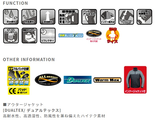 急な天候や気温の変化にも対応し、ライダーを強力にサポートするライディングジャケット。防水・防風・透湿性等に優れた素材を採用、すべてのテクノロジーを投入した一着です。様々な状況下で安定したコンディションをキープし、ショートトリップからロングツーリング、そしてハイスピード・ライディングと多様なステージまで幅広く対応。また、防寒対策として着脱式インナージャケットを装備。酷暑の夏に対応できるベンチレーション機能は、長年培ったノウハウを惜しみなく投入しました、胸部、フロントVベント、アーム部からの外気のエアインテークを大型バックベンチレーションパネルより効率的に排気し、驚くほど効果的に衣服内環境を最適な環境に保ちます。【酷暑でも快適、高機能ベンチレーション】大きく開く胸部ベンチレーション、フロントVベント、・腕部ベンチレーション、大型バックベンチレーションパネルより効率的に排気。衣服内環境を快適に保ちます。【優れたプロテクション性】胸・肩・肘・脊椎すべてをガードするフルプロテクションパッドを装備しライダーをガード。肩・肘は新型のベンチレーションCEパッドを採用。【上質な素材】軽く、肌触りの良い高品質なメイン素材で、既存品にない軽やかな着用感で長時間の着用も苦になりません。【防水・透湿機能】実地テストを重ねた確かな防水機能と湿気を放出する透湿機能を備え、雨風の侵入をシャットアウトします。【機能的なポケット】使用シーンを考えて用意された多くのポケットは、ツーリングシーンでの使い勝手を考慮して設計されています。【豊富なサイズ設定】大きな方までカバーする豊富に揃えたサイズ設定であらゆるニーズに応えます。【オールシーズン対応】防寒インナー標準装備。外して使うのはもちろんオールシーズン対応ファスナーで寒いときにはオプションインナーを合体し、防寒性をアップすることも可能。表地/ヘリンボーンデュアルテックス加工(ポリエステル、ナイロン、TPUボンディング)裏地/メッシュ(ポリエステル)、インナー/タフタ(ナイロン)インナー中綿/ウォームマックス(ポリエステル)インナー襟裏/起毛トリコット(ポリエステル)PROTECTOR:胸・肩・肘・脊椎パッド 標準装備(肩・肘はCE規格)防寒インナージャケット標準装備