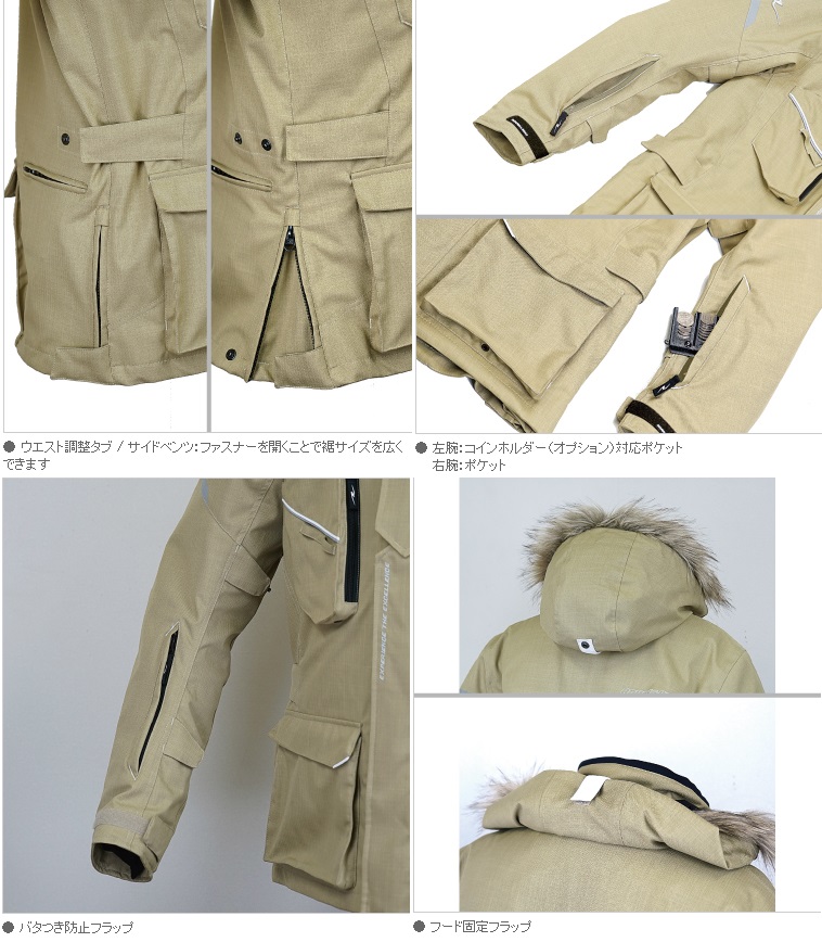 ※商品詳細画像には同モデル別カラーの画像がございます。予めご了承くださいませ。厳冬の季節、防寒性能を極めることにフォーカスしたスペシャルウォームジャケット。脱着可能なファー付きフードとアウターネックウォーマーが、襟首周りから寒風の侵入を許さず、裾からの侵入はストームガードでシャットアウトし体熱を逃しません。インナージャケットの裏地はチタンをスパッタリング加工し、体熱を効果的に反射し高効率で身体を保温。さらに、中綿には超軽量・イージーメンテナンス性を兼ね備えた最高クラスの保温力を誇るPrimaLoft(R)Gold Insulation with Cross Core(R)(プリマロフト(R)・ゴールド・インサレーション・ウィズ・クロス・コア(R))を採用し究極の防寒性を誇ります。プリマロフト?は、羽毛に代わる画期的な超微細マイクロファイバー素材で羽毛のように軽くて暖かい保温性と柔軟性を発揮するだけではなく、羽毛にはない撥水性を備えており水にも強い機能性(メンテナンス性・断熱性・防寒テクノロジー)と、過酷な環境でも使える高い実用性を備えた先進の人工羽毛です。最高の機能と最高の素材を惜しみなく投入した究極(ポーラー)ジャケットは冬でしか味わえない景色を求める、元気なライダーをどこまでもサポート。防寒・防水・防風・保温することを高次元で両立させたスペシャルウインタージャケットです。MATERIAL: 表地/ポリエステルヘリンボーン、フェイクファー、防風ストレッチ素材裏地/ウォーターシールドEXインナー/エンボスタフタ、チタン起毛トリコット中綿/プリマロフト(R)PROTECTOR: 胸・肩・肘・脊椎パッド 標準装備プリマロフト(R)インナージャケット 標準装備