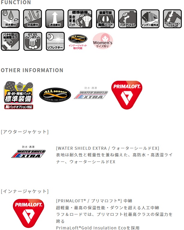 ※商品詳細画像には同モデル別カラーの画像がございます。予めご了承くださいませ。ウインターパーカーにプリマロフト インナージャケットをインサートした、厳冬期寒風をものともしない、防風・防水・透湿、超防寒仕様で、ツーリングシーンを暖かくサポートします。プリマロフトは米国のAlBany社により、米軍向けの中綿素材として開発された、超軽量最高の保温性能、撥水性、イージーメンテナンス性を兼ね備えた超微細マイクロファイバー素材で、過酷な環境でも使える画期的な人工中綿です。ロング・ショートツーリングはもちろん、名所、旧跡等も躊躇なく行けるさりげないデザイン。また、ベンチレーション装備のため、インナージャケットを外して3シーズンジャケットとして秋冬春と長期間活躍します。付属のインナージャケットはシンプルなデザインで単体着用も可能ですMATERIAL:表地/タッサー(ナイロン)、裏地/タフタウォーターシールド加工(ナイロン、TPUボンディング)、インナー/タフタ(ナイロン)、起毛トリコット(ポリエステル)、中綿/プリマロフト(ポリエステル)PROTECTOR:肩・肘・脊椎パッド 標準装備 (胸パッドはオプション)プリマロフト(R) インナージャケット 標準装備