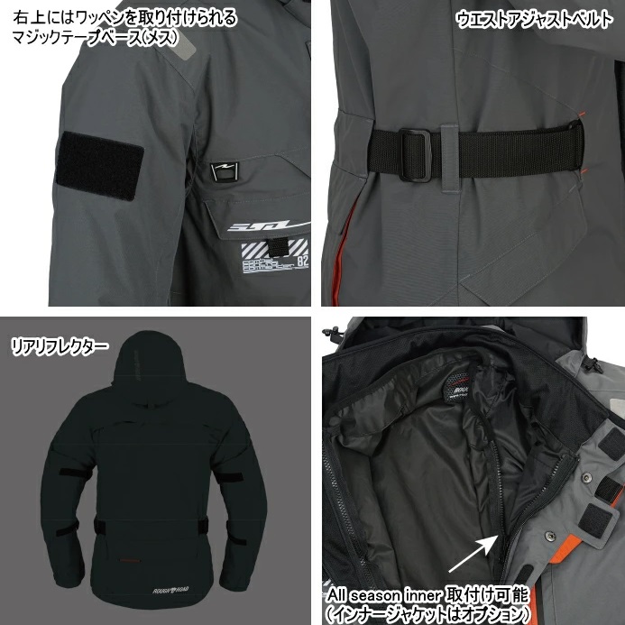 ※商品詳細画像には同モデル別カラーの画像がございます。予めご了承くださいませ。機能的、特徴的な収納に困らない多彩なポケットを備え、ツーリングシーンで活躍するミリタリーカジュアルなテイストのオールシーズンジャケットです。メイン素材は風合いが良く、超撥水加工を施したナイロンにデュアルテックスコーティングを施し、縫い目はファクトリーシームシーリング。防風・防水・透湿性の高いデュアルテックスなので衣服内を常にドライに保ち、快適な着心地です。肩・肘・脊椎パッドを装備し、オプションの胸パッドの装着も可能で、いざという時の安心感が違います。また、フロントVベント、袖ベント、背中ベントと快適なベンチレーション機能を装備し酷暑の夏も快適に過ごせます。この強力なベンチレーション機能と豊富なオールシーズン対応インナージャケットを組み合わせレイヤードを工夫すれば暖かい季節から寒い季節までフルシーズン活躍します。MATERIAL: 表地/ポリエステル 裏地/ナイロン(タフタ) 襟裏/ポリエステル(吸汗・速乾)PROTECTOR: 肩・肘・脊椎パッド 標準装備 (胸パッドはオプション)