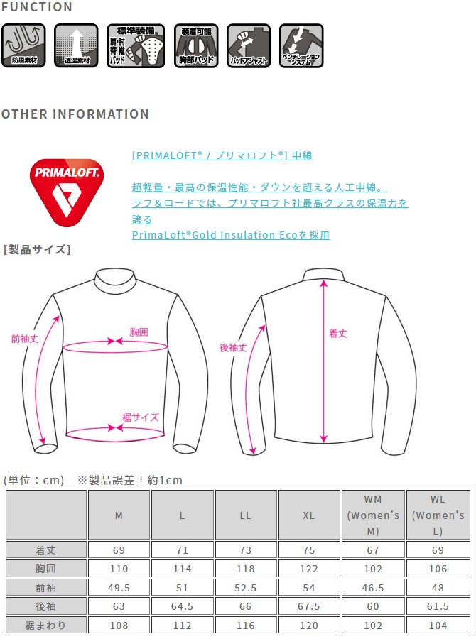 ※商品詳細画像には同モデル別カラーの画像がございます。予めご了承くださいませ。ダウンに匹敵する高機能素材、プリマロフト(R)の中綿入りパーカー。中綿には超軽量・イージーメンテナンス性を兼ね備えた最高クラスの保温力を誇る「PrimaLoft Gold Insulation with Cross Core 」(プリマロフト(R)・ゴールド・インサレーション・ウィズ・クロス・コア)を採用し最高の防寒性を誇ります。プリマロフト(R)は、羽毛に代わる画企的な超微細マイクロファイバー素材で、羽毛のように軽くて暖かい保温性と柔軟性を発揮するだけではなく、羽毛にはない撥水性を備えており水にも強い機能性(メンテナンス性・断熱性・防寒テクノロジー)と、過酷な環境でも使える高い実用性を備えた先進の人工中綿です。表地の質感の高いヘリンボーン素材で、やわらかく防風仕様で外気を遮断します。暖かすぎた時のためのベンチレーションも備え、衣服内温度が調整可能で快適なライディングに対応。ライディングウエアとしてはもちろん、お洒落なアーバンデザインで街着としても気軽に羽織って出かけられるフットワークの軽さで、行動範囲が広がります。MATERIAL:表地/ヘリンボーンデュアルテックス加工(ポリエステル、ナイロン、TPUボンディング)裏地/ボア(ポリエステル)、タフタ(ナイロン)中綿/プリマロフト(R)(ポリエステル)PROTECTOR: 肩・肘・脊椎パッドOPTION:胸パッド