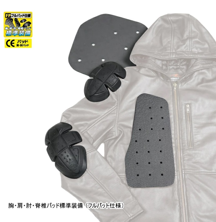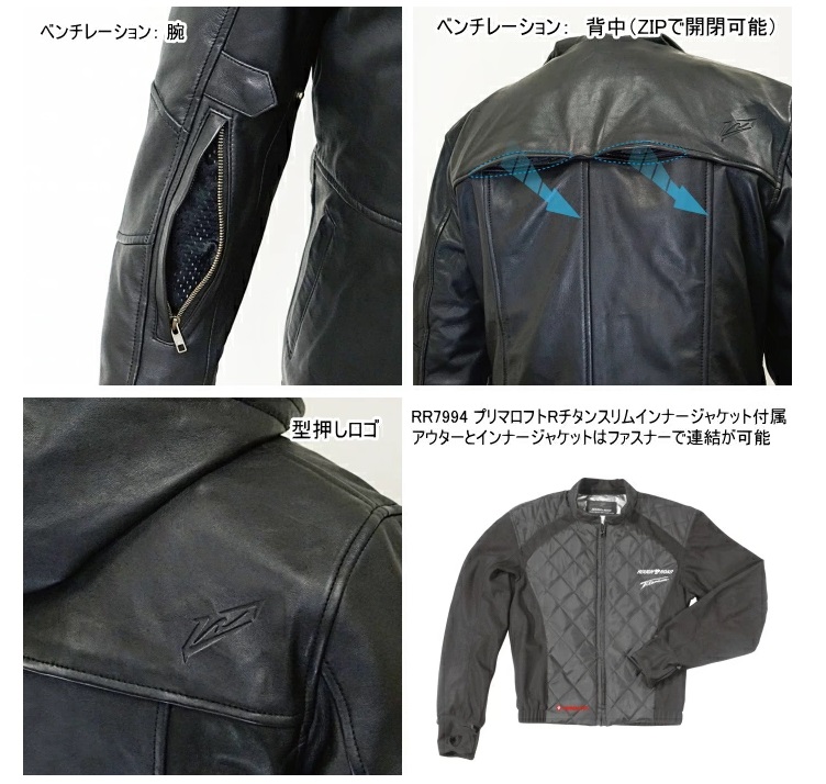 ※詳細画像には同モデル別カラーの参考画像が含まれております。ご注意下さい。RA5033 シープレザーパーカーFPにスリムで暖かいRR7994 プリマロフト(R)チタンスリムインナージャケットを標準装備シープレザーのしなやかさによる着心地の好さは格別RA5033 シープレザーパーカーFPにインナージャケットを付属したお得なセット商品。シープスキンはきめが細かく保湿性の高いしなやかな風合いで、カジュアルなパーカースタイルに最適な素材です。気軽に羽織れる気楽さはデイリーユースで大活躍間違いなし。アクシデントに備え、プロテクターは胸、肩、肘、脊椎パッドをフル装備した本格派。開閉量調整が可能なアームベンチレーション、バックベンチレーションを装備し、着用時の温度管理が可能です。また、付属のインナージャケットを装着することで寒い時期にも対応することが可能な、見た目にそぐわぬ歴としたライディングレザーパーカーです。MATERIAL:表地/シープレザー 裏地/ナイロンPROTECTOR:胸・肩・肘・脊椎パッド標準装備 (フルパット仕様、肩・肘はCE規格)