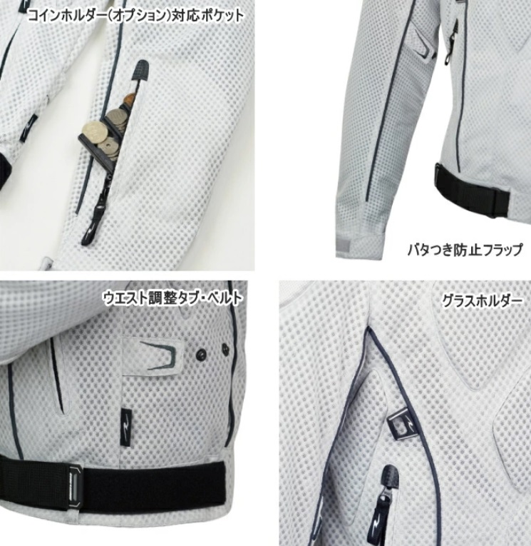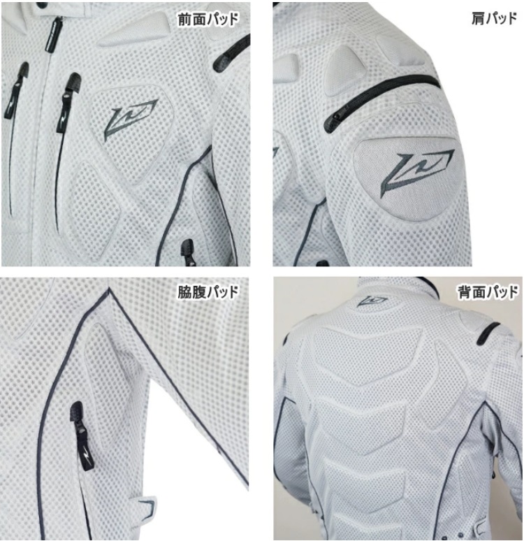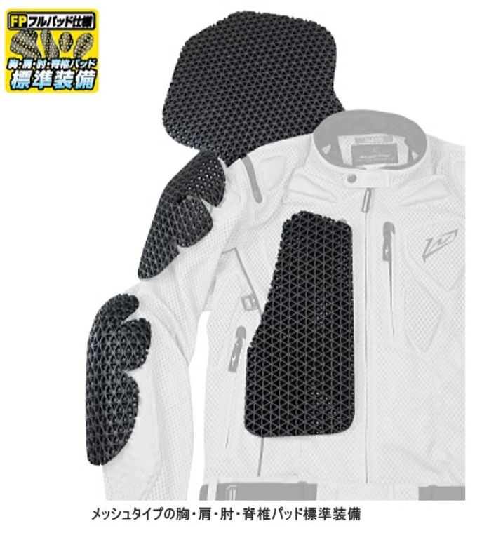 ※詳細画像には同モデル別カラーの参考画像が含まれております。ご注意下さい。肩・肘・胸・脊椎にエアスルーパッドをフル装備さらにジャケット本体の要所要所にパッドを装備した最強のプロテクションジャケットライディングメッシュジャケットのフラッグシップモデルとして定番のハードプロテクションメッシュジャケットがリニューアル。通気性と生地の強さを兼備したタフメシュをメイン素材を採用し、機能性を飛躍的にパワーアップしました。タフメシュは通常のメッシュ生地とは違い、穴となる部分にも糸を通すことで非常に優れた引き裂き強度と耐摩耗性を実現。また、ライディング用ジャケットの一番の役割であるプロテクション性を高い次元でクリアしながら、メッシュの役割である通気性も損なうことなく確保。バイク乗りが一番軽装で危険な暑い時期に最適なジャケットとしてバージョンアップ。万一の転倒時ヒットしやすい、また致命傷につながる部位には動きや操作性を妨げない配置でウレタンパッドを内蔵し、さらにプロテクション性を補強しました。MATERIAL: 表地/タフメッシュ、ウレタンパッド 裏地/スーパーエアメッシュ 襟裏/クールマックスメッシュ