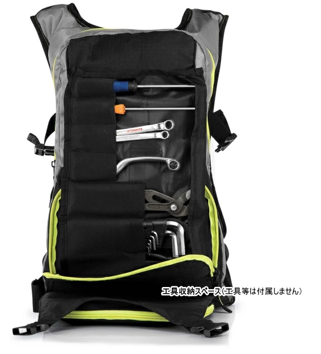 2リットルウォーターバッグを備え、工具も収納できるバックパックエンデューロ等の過酷なレースでは必需品となる2?のハイドレーションシステムを装備したバックパック。ウォーターパックの注水口は内部洗浄のしやすい大口径。そのウォーターパック収納部は断熱素材で内容物を保温します。外ポケットにはツールやスペアパーツが収納できるスリットを装備。背面はクッションパネルとメッシュ生地で通気性を確保。ホールド感を高めるチェストハーネスとウエストベルトも装備しています。MATERIAL:ポリエステル95%、他5%