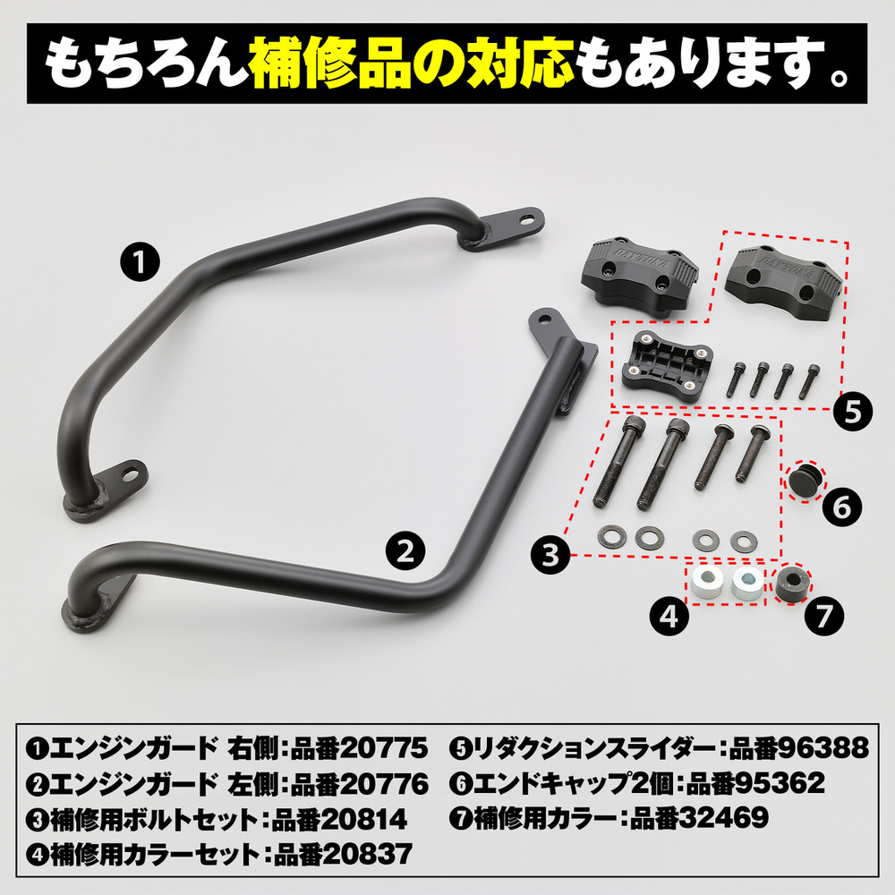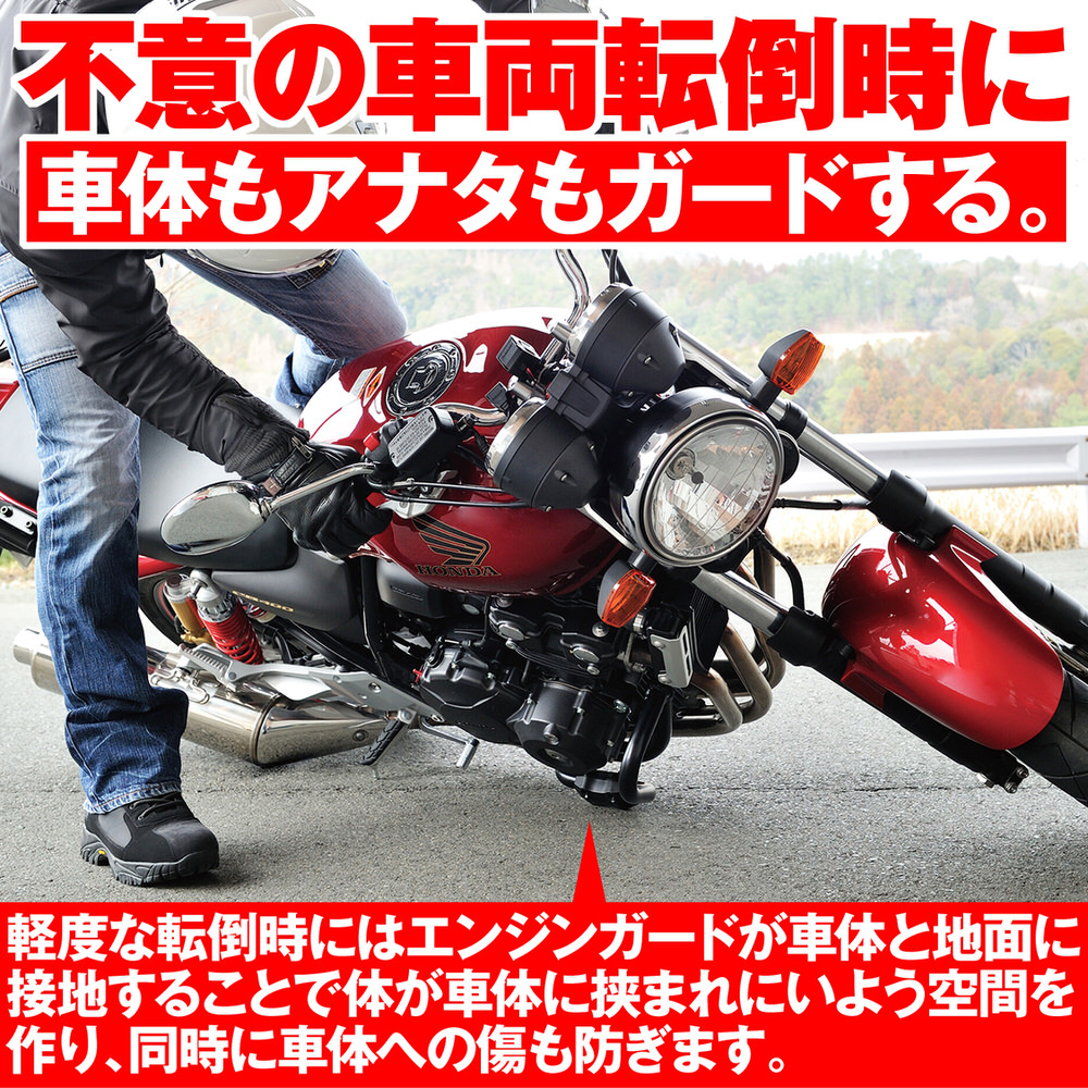 大きく張り出さず目立ちにくいエンジンガード。マットブラックのパイプをコンパクトにレイアウトすることで、車両のイメージを損なわない。ボルトオン装着可能なφ25.4スチールパイプ製。立ちゴケ等の軽度な転倒に対し、エンジンやカウルのダメージを軽減します。φ25.4のパイプはアメリカンのハンドルと同径なので、アクションカメラなどハンドルにクランプする用品の装着も可能。軽度な転倒時にクランクケース回りを保護し、エンジンへのダメージを最小限に大きく外側へ張り出さない仕様で、装着してもスタイリッシュで目立ちにくいデザインリダクションスライダーがエンジンガードの傷も抑止車体フレームに合わせたマットブラック塗装