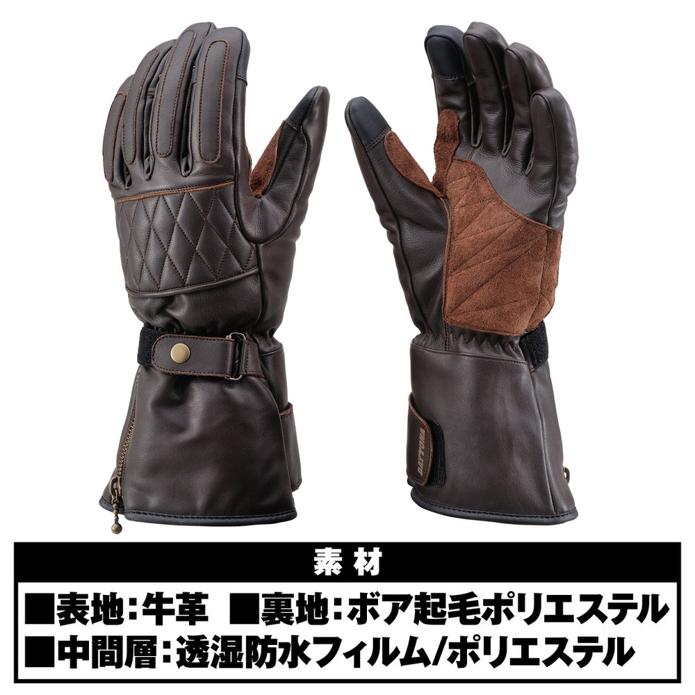 ツヤ感のあるしっとりとした牛革を全面に使用。レザーと防風防水透湿フィルムによる防風性に、裏地ボアを組み合わせることで高い防寒性を発揮。指先のパッチとナックルダイヤモンドステッチにより高級感のあるクラシカルな雰囲気グローブです。シーズン:秋冬牛革を全面に採用し、ダイヤモンドステッチ加工を施したクラシカルグローブ防風防水透湿フィルム+裏地にボアで高い防寒性を発揮タッチパネル対応※タッチパネル対応はグローブへの密着度や個人差により感度にばらつきがあります。※経年劣化や使用状況により防水フィルムが破損することがあります。
