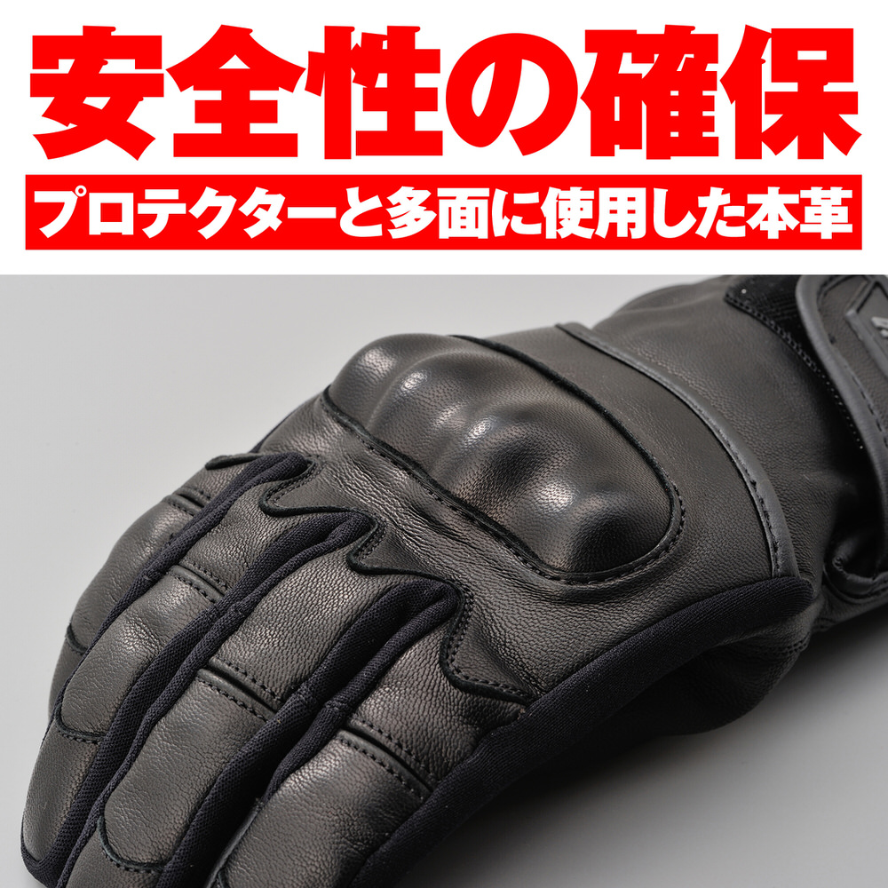 ハードナックルプロテクターと多面に使用した本革(ヤギ革)により安全性を確保。レザーと防風防水透湿フィルムによる防風性に、裏地ボアを組み合わせることで高い防寒性を発揮。指先の形状やパターンを見直し、ストレッチ素材と組み合わせることで握りやすさを向上。乗るバイクを選ばないシンプルなデザイン。シーズン:秋冬ヤギ革を全面に採用した、乗るバイクを選ばないシンプルなグローブ防風防水透湿フィルム+裏地にボアで高い防寒性を発揮タッチパネル対応※タッチパネル対応はグローブへの密着度や個人差により感度にばらつきがあります。※経年劣化や使用状況により防水フィルムが破損することがあります。