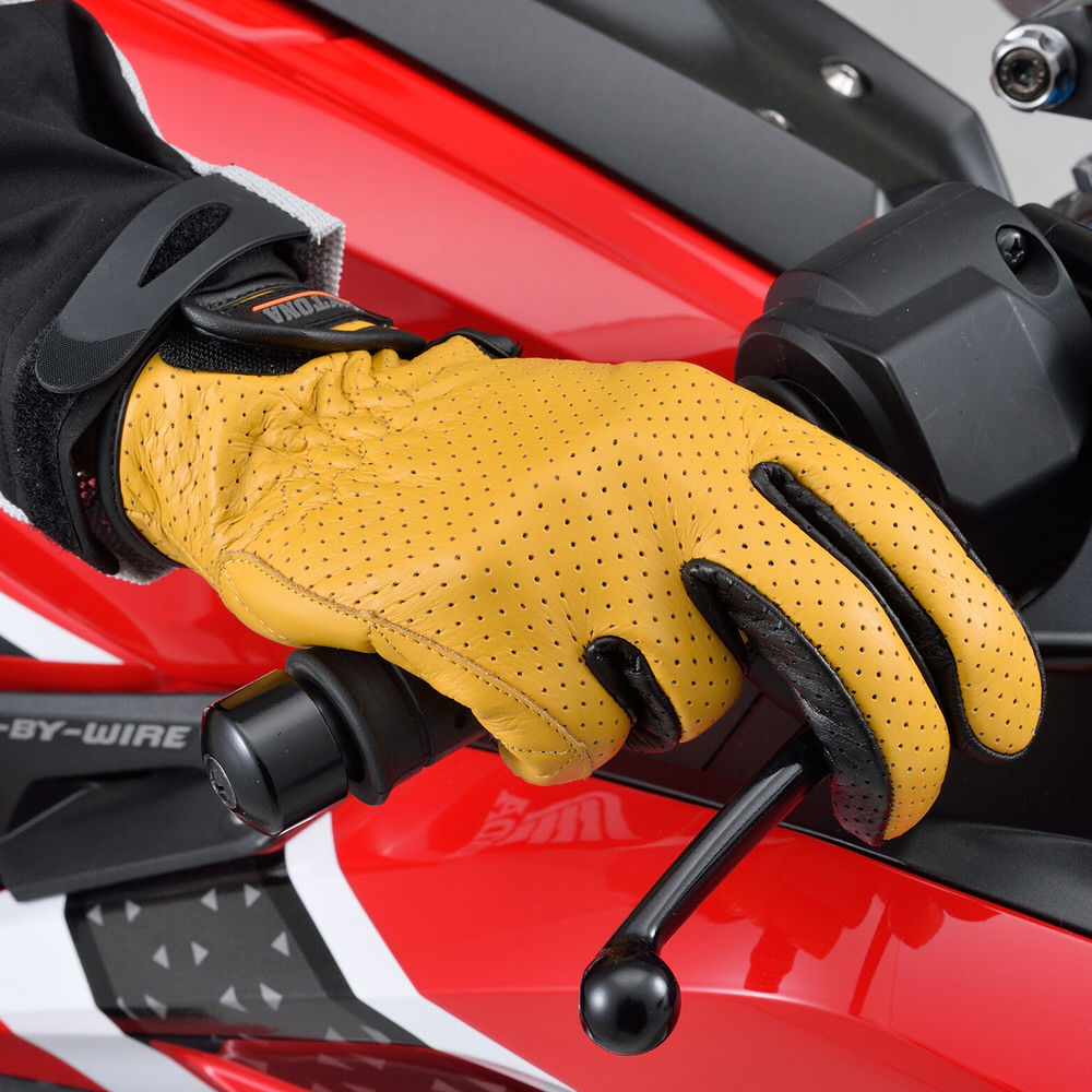 しっとり柔らかな牛革をフィット感の良い立体裁断で仕立てたライディンググローブ。パンチング部は裏地もメッシュ生地にすることで、通気性を確保しました。人差し指のタッチパネル対応部は側面まで回り込んでいるので、ストレスなくスマートフォンを操作できます。サイズ:Sサイズカラー:イエロー素材:牛革 / メッシュ生地パンチング / 春夏秋タッチパネル対応