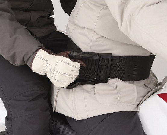 制動時のもたれ込みや引っ張り、前への動きや制動時の動きも、グリップに掴まることでタンデムライダーのポジション変化に対応します。グリップ部の幅を広くかつ斜めにすることにより、グリップをより握りやすくしています(滑り止め機能付)。運転するライダーの体への食い込みを制御するため、厚みのあるベルトを採用。
