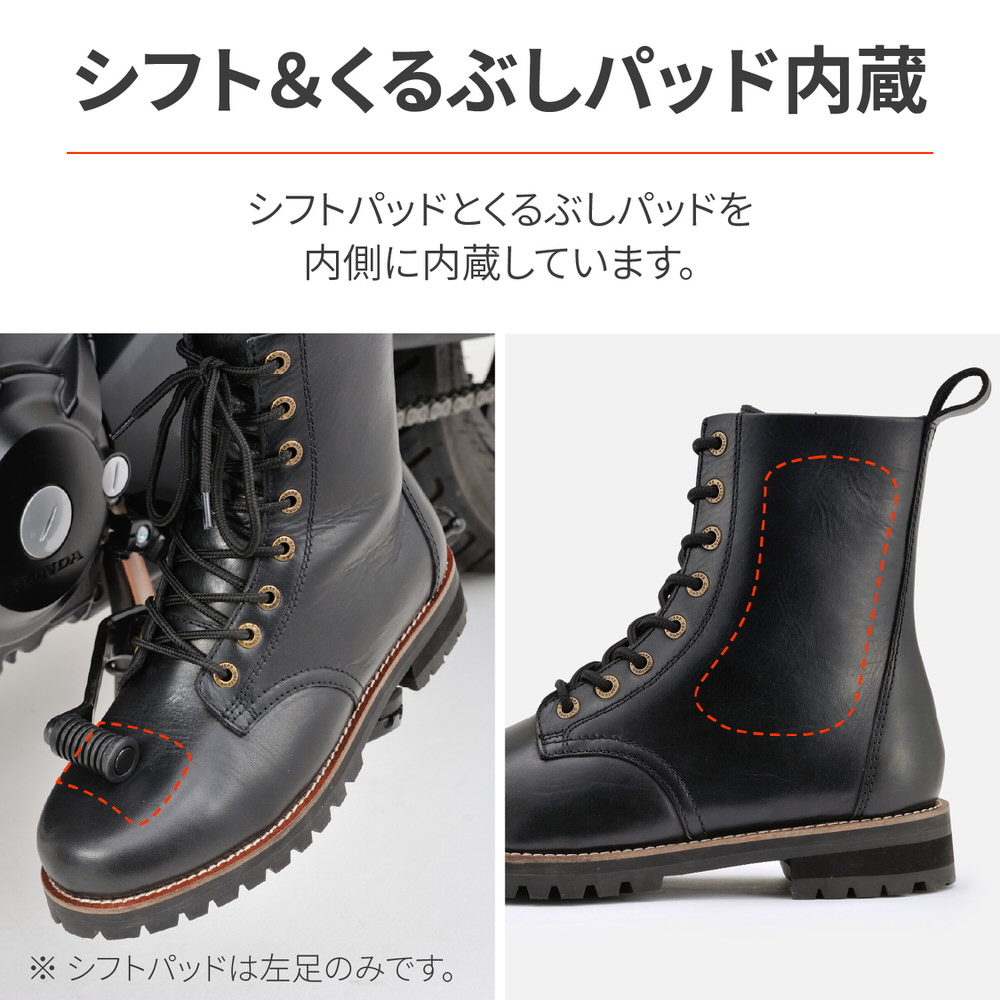 こだわり抜いた上質でしなやかなフルグレインレザーを使用しているので、履き込むほど足へ馴染み、自分好みのエイジングが楽しめます。「いかにもバイク用」という見た目ではなく、バイクを降りてアーバンシーンにもマッチします。シフトパッドやくるぶしパッドは内側に内蔵。ソールは違和感のない厚底で足つき性がよく、土踏まず部を滑り止め加工することで安定したライディングが楽しめます。ミドル丈の高さによって、程よいホールド感が得られます。着用感や見た目にこだわった、ミドルカット専用の新規足形設計。ワイズ2E相当。牛革のフルグレインレザーを使用履き込むほど足へ馴染み、自分好みのエイジングが楽しめますシフトパッド、くるぶしパッドを内側に内蔵違和感のない厚底で足つき性がよく、土踏まず部に滑り止め加工ワイズ2E相当※防水機能はありません。
