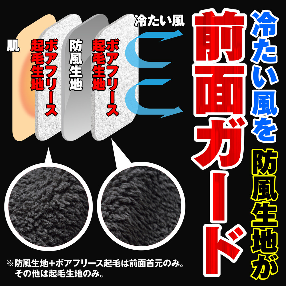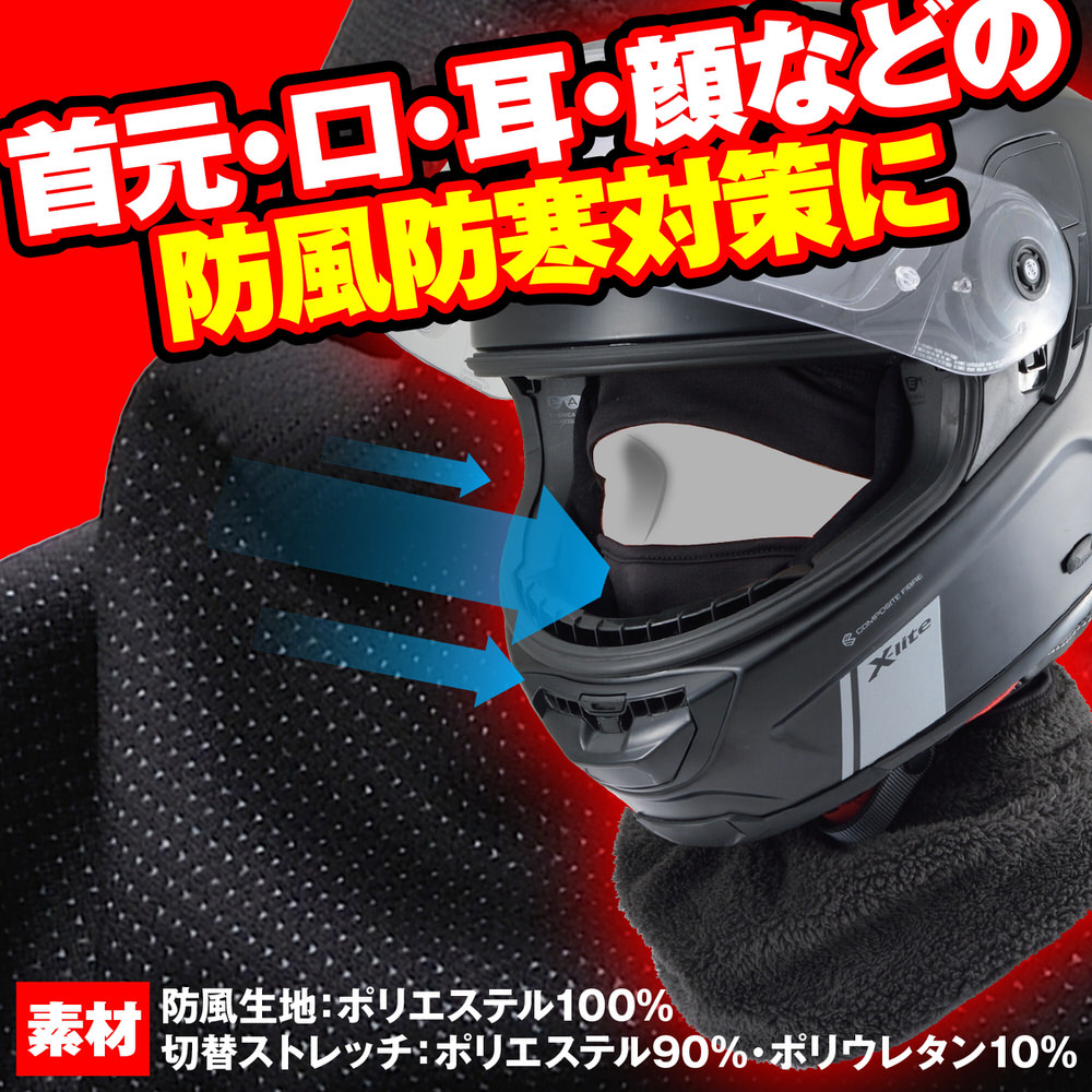 3WAY仕様のネックウォーマーで首元防寒対策。ボアフリース起毛生地で肌触りがよく、走行中の冷たい風を防風生地がガッチリガード。寒い季節のライディングで一番気になるのは寒さ。体温の低下は疲労感を増幅させ、体力も消耗します。フルフェイスマスクを着用することで、隙間から侵入する冷たい風をガード。ボアにより防風生地と身体との空間が生まれ、抜群の保温力を発揮。ヘルメットの装着を前提にボアを配置したのでフィット感も抜群。キャップタイプなのでヘルメットをかぶった時にずれにくく、ヘルメットの汚れ防止にもなります。首元以外にも、口元、耳、顔、頭と各所を保温。秋冬用ネックウォーマー ボア付き走行中の冷たい風を防風生地がガッチリガード肌触りの良いボアの裏地で保温力アップ隙間から侵入する冷たい風をガード首元以外にも口元、耳、顔、頭と各所を保温
