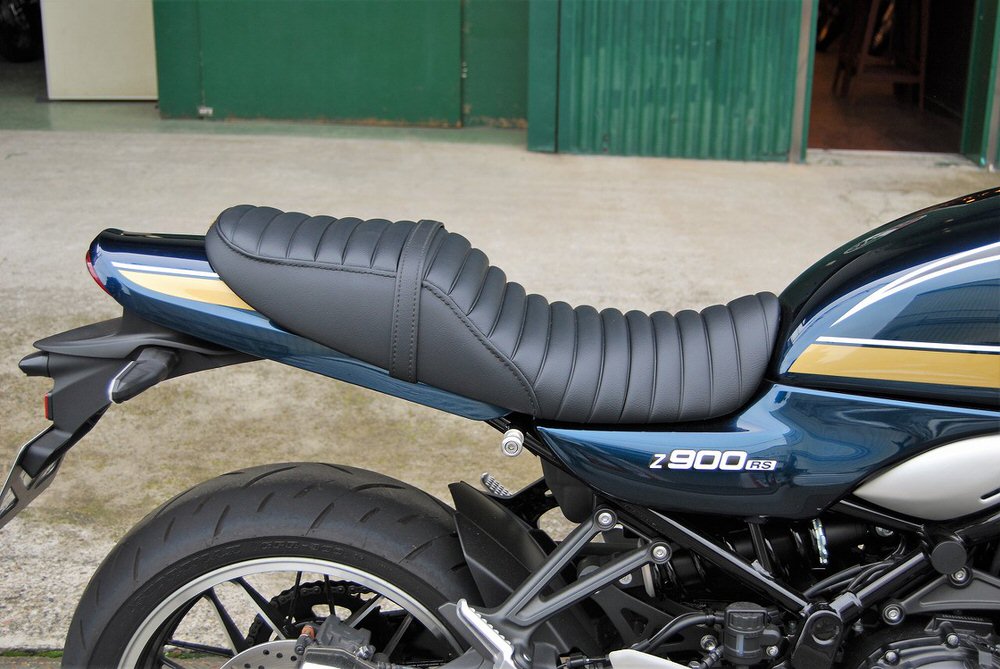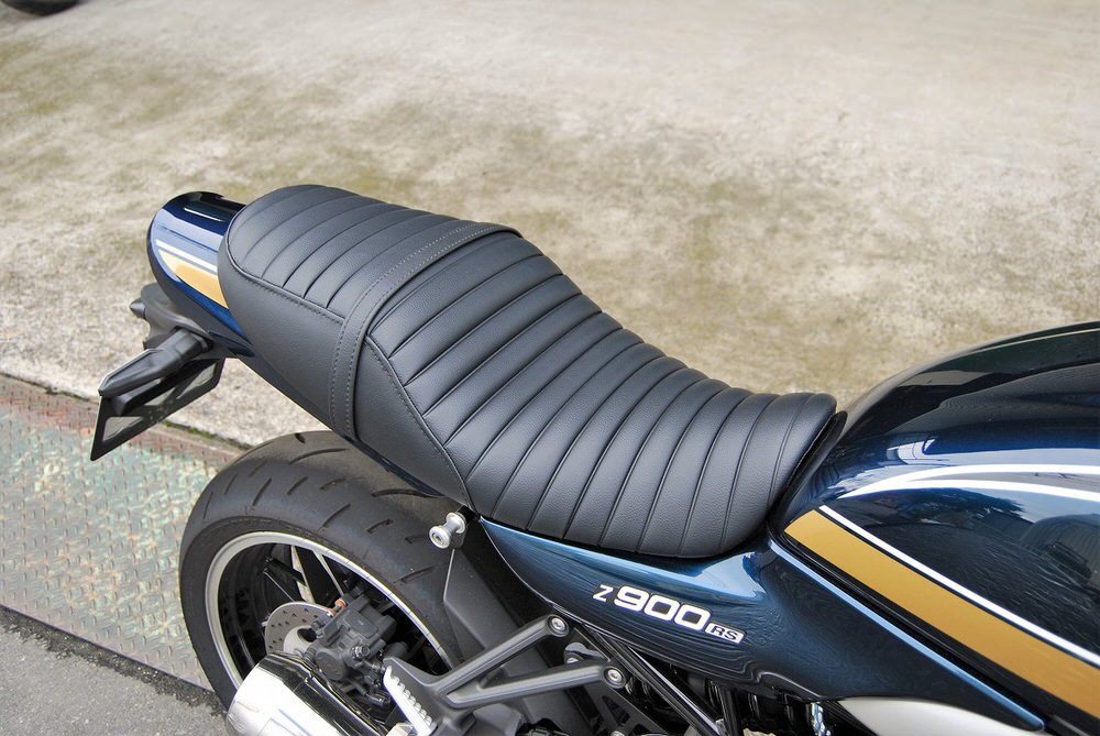 シート高は純正シート比−5mm程度ですが、足を下す部分の幅を細くテーパー形状にすることで、足を下した際、内腿にスポンジの角張りを感じず足を真っ直ぐ下せるようになります。前下がり傾斜の強い純正シートは、お尻が前方へズレることに強い違和感を覚えます。元気な内は良いのですが、ロングツーリングで疲れが出始めた復路などでは苦痛に感じます。のろのろ渋滞では上半身をハンドルで支え、加速では後ろへずれ、減速でまた前にずれと楽しいツーリングが我慢大会に…。弊社製シートは、座面の前傾斜を見直したことにより、加減速に対して骨盤の位置を一定に保つことが出来ます。上体が安定すると純正シートのときの様なハンドル荷重をせずに乗車が出来るので、長時間のライディングでライダーの負担軽減にも繋がります。着座位置が高くなることで膝の曲がりも緩くなり、ステップ荷重が増え、お尻への負担軽減に加えステップの荷重抜重での車体操作がし易くなります。車体操作をより一層楽しんでいただけるシートとなっております。足つき 乗り心地足を下す部分の幅を絞りながら内腿に沿う形状となっていますので、足を真っ直ぐ下せ足先に力を入れ易く、車体も支え易くなっています。逆に、着座位置の幅は広く取ってありますので、お尻を支える面が広く快適性も向上します。パッセンジャー座面裏側にある純正工具ホルダー取り付けをキャンセルし、その分シートベースを低床化してスポンジ厚を稼いでいます。パッセンジャー側座面のスポンジストローク量が増えたことで乗り心地が良くなりますので、タンデムツーリングをする方にもお勧めです。シート高ローシート:795mm×SE装着時805mm(純正シート:800mm×SE810mm)座面にプレーンブラックレザーのタックロールを使用。縫い合わせのステッチラインが途中で下に落ちるBタイプです。標準装備のタンデムベルトは、ボルト留めで着脱が可能。取り付けは純正シート同様キーロック方式となります。シート下にMITSUBA製同等サイズのドライブレコーダーを設置するスペースを設けています。スポンジの硬さは、体重60-80kg程度を標準設定としています。型の中で発砲させたインジェクションスポンジを使用。クッション性が良く経年劣化が少ないため、長くご愛用頂けます。ご注意シート裏側の純正工具ホルダーは取り付け不可。すべて標準の仕上げとなります。