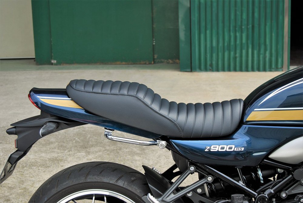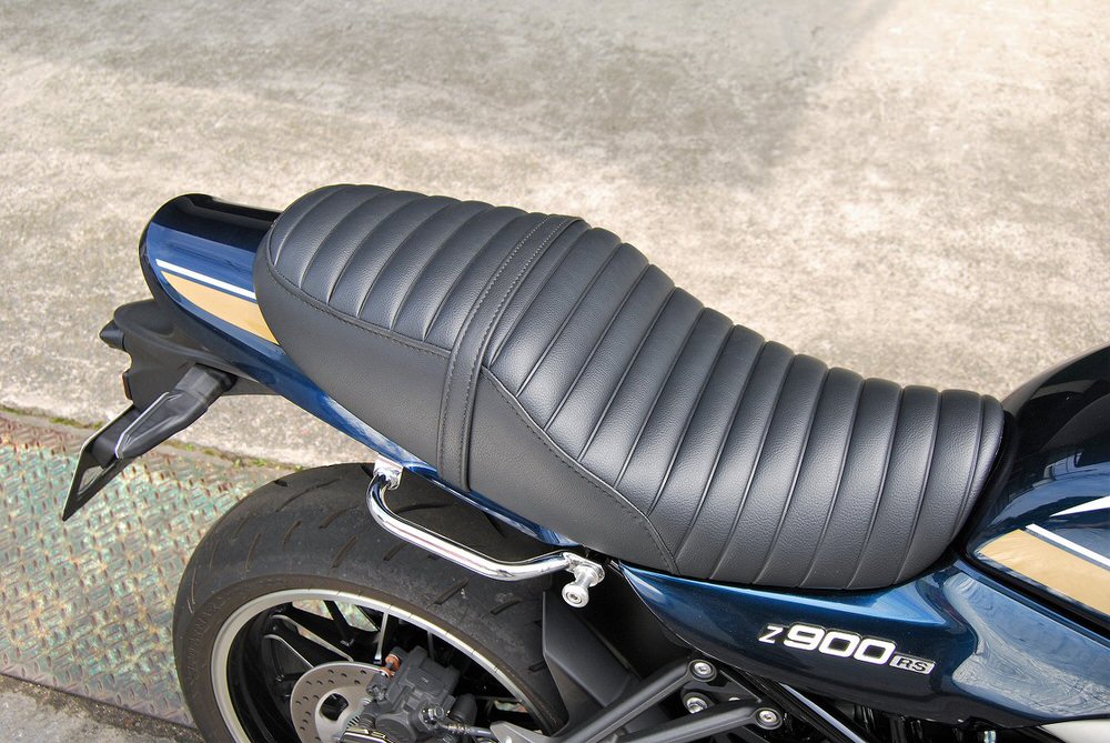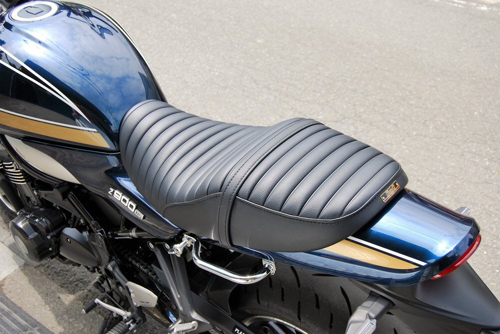 前下がり傾斜の強い純正シートは、お尻が前方へズレることに強い違和感を覚えます。元気な内は良いのですが、ロングツーリングで疲れが出始めた復路などでは苦痛に感じます。のろのろ渋滞では上半身をハンドルで支え、加速では後ろへずれ、減速でまた前にずれと楽しいツーリングが我慢大会に…。弊社製シートは、座面の前傾斜を見直したことにより、加減速に対して骨盤の位置を一定に保つことが出来ます。上体が安定すると純正シートのときの様なハンドル荷重をせずに乗車が出来るので、長時間のライディングでライダーの負担軽減にも繋がります。着座位置が高くなることで膝の曲がりも緩くなり、ステップ荷重が増え、お尻への負担軽減に加えステップの荷重抜重での車体操作がし易くなります。車体操作をより一層楽しんでいただけるシートとなっております。足つき 乗り心地足を下す部分の幅を絞りながら内腿に沿う形状となっていますので、純正シートよりもシート高が上がっても、同程度の足つきを実現しています。足を下す部分とは逆に、着座位置の幅は広く取ってありますので、お尻を支える面が広く快適性も向上します。パッセンジャー座面裏側にある純正工具ホルダー取り付けをキャンセルし、その分シートベースを低床化してスポンジ厚を稼いでいます。パッセンジャー側座面のスポンジストローク量が増えたことで乗り心地が良くなりますので、タンデムツーリングをする方にもお勧めです。シート高ミディアムシート:815mm×SE装着時825mm(純正シート:800mm×SE810mm)座面にプレーンブラックレザーのタックロールを使用。縫い合わせのラインはステッチ仕上げで、ラインが途中で下に落ちるBタイプです。標準装備のタンデムベルトは、ボルト留めで着脱が可能。取り付けは純正シート同様キーロック方式となります。シート下にMITSUBA製同等サイズのドライブレコーダーを設置するスペースを設けています。スポンジの硬さは、体重60-80kg程度を標準設定としています。型の中で発砲させたインジェクションスポンジを使用。クッション性が良く経年劣化が少ないため、長くご愛用頂けます。ご注意シート裏側の純正工具ホルダーは取り付け不可。すべて標準の仕上げとなります。