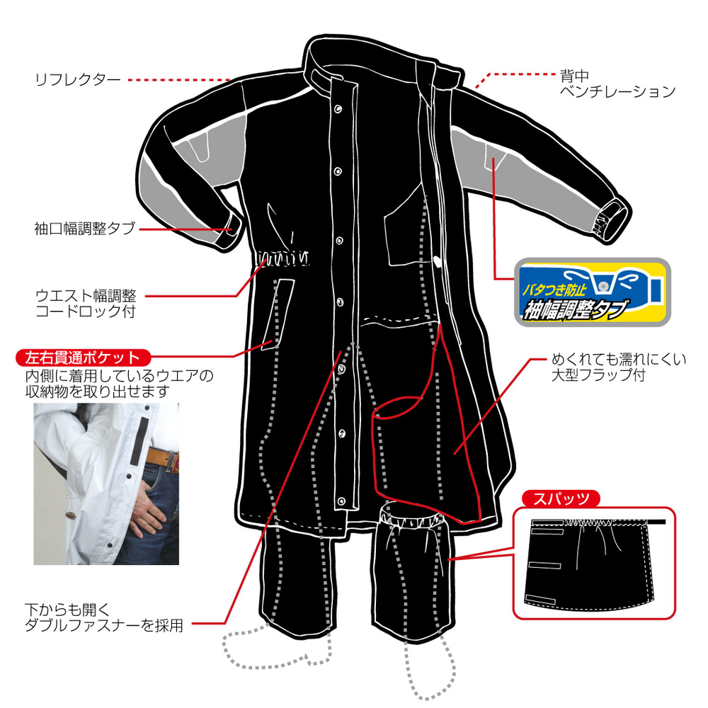 スクーター専用設計の防水・透湿ライディングレインコート。サッと羽織れる気軽さと、足元には防水スパッツを装備。スクーター専用設計の防水・透湿ライディングレインコート。サッと羽織れる気軽さながら、裾がめくれても濡れないフラップや足元を雨から守るスパッツも付属とスクーターライディング専用機能を装備。左右ポケットは貫通タイプで、レインコートを着たまま中のウエアのポケットにアクセスできます。別売りのインナージャケットを取り付ければオールシーズン着用が可能と一年中大活躍。※コートの特性上着座姿勢では裾から雨が入るケースがあります。MATERIAL: 表地/ポリエステル70Dデュアルテックス加工 裏地/ポリエステルエアメッシュ 襟裏/起毛トリコット 収納袋、スパッツ付き