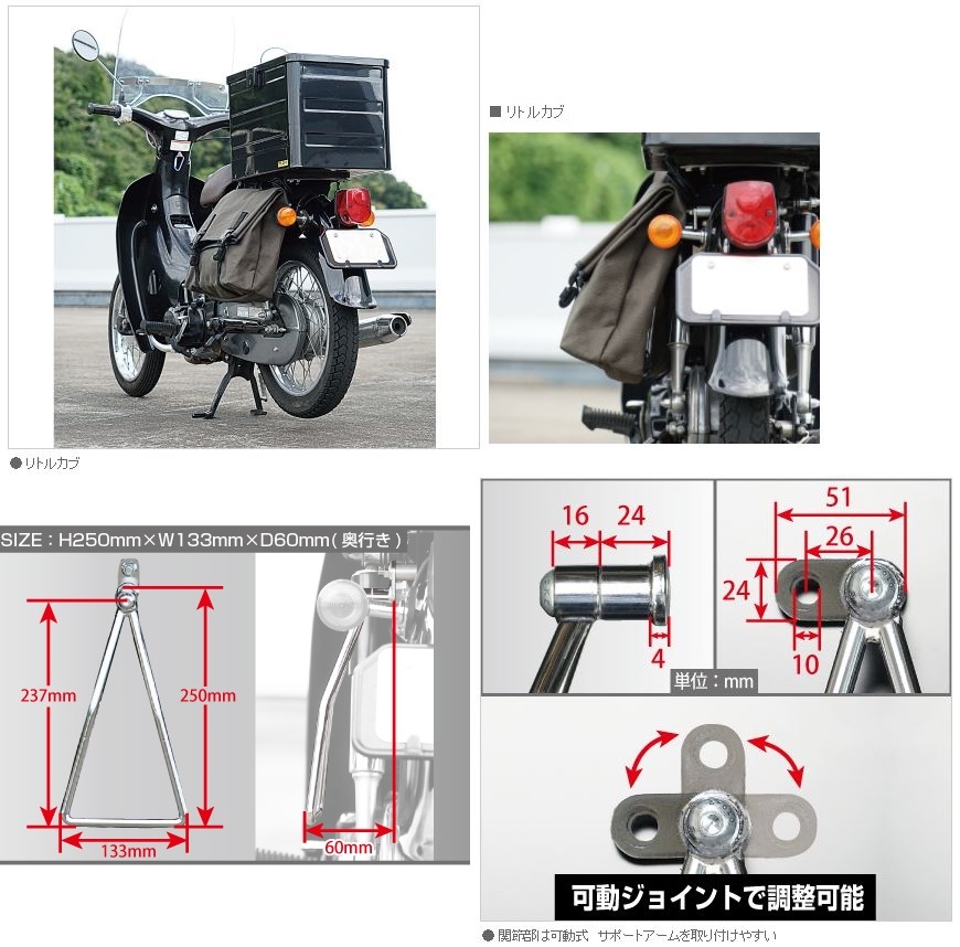 サイドバッグの積載時の車体とのスレ防止、タイヤへの干渉はもとより危険な巻き込みをふせぎます。車体への接続部を可変ピースにすることで取り付け自由度が高く、サポート本体も角度をつけた取り付けが可能。車種汎用度の高い簡易サイドバッグサポートです。寸法: 縦約25cm 横(下側)約13.3cm 高差約6cm ※上部画像参照。縦横は両端からの測定値。