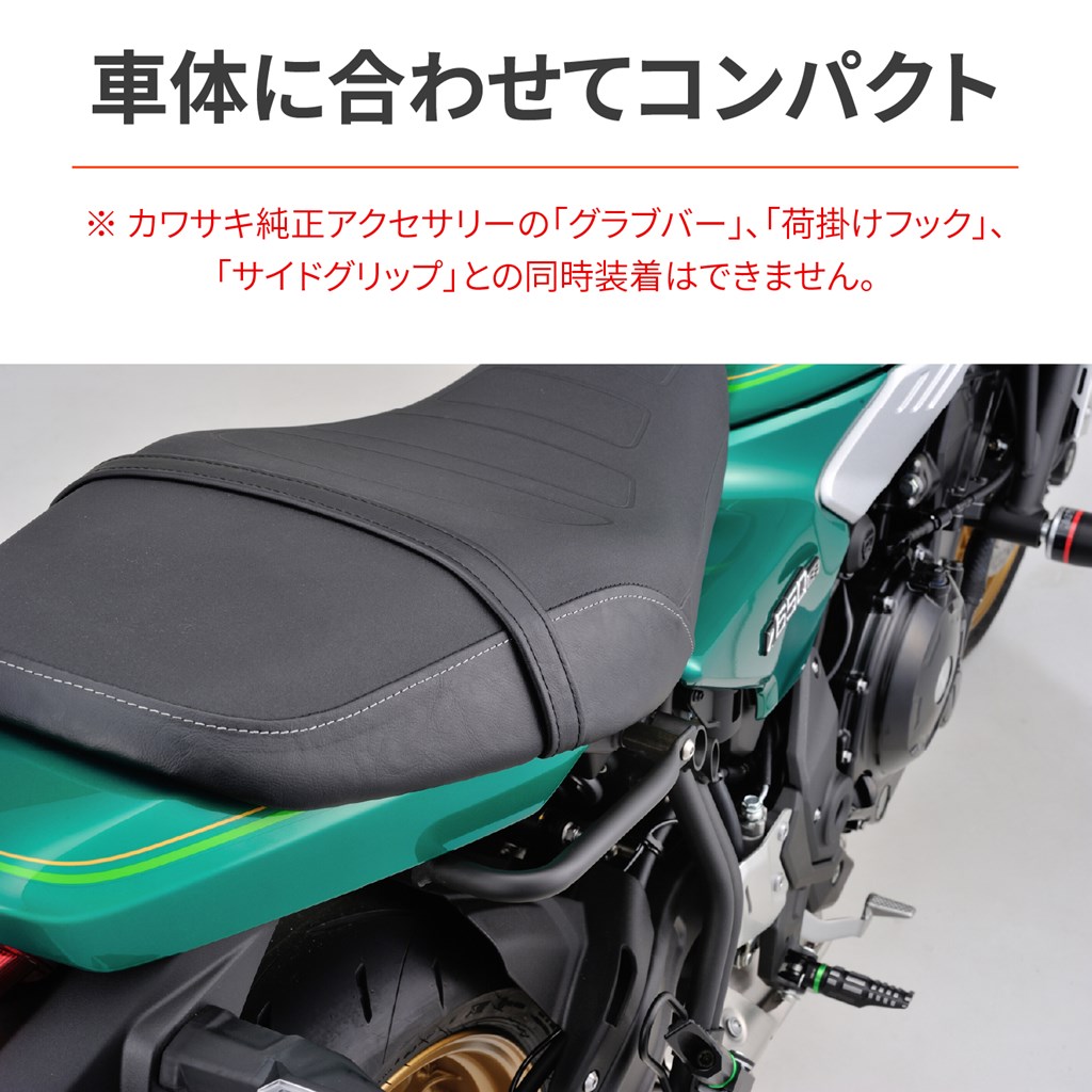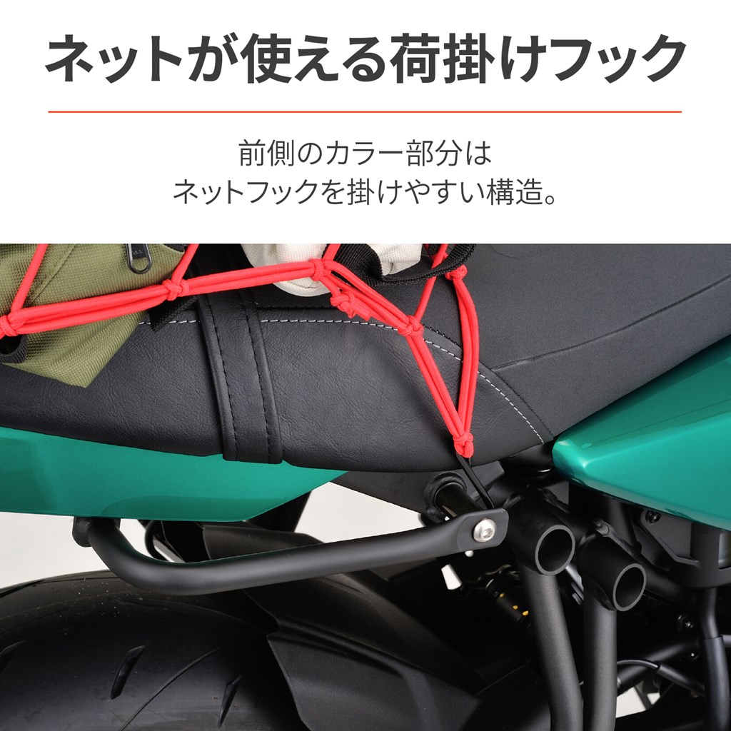 コンパクトで使いやすいアシストグリップ。車体の取り回しで活躍するアシストグリップです。前側のカラー部分はネットフックを掛けやすい構造にしています。右側専用車体の取り回しで活躍荷掛けフック付きパイプ径:φ15.9 スチール製マットブラック塗装仕上げ※Z650RS 50th Anniversaryは純正グラブバーの取り外しが必要です。※カワサキ純正アクセサリーの「グラブバー」、「荷掛けフック」、「サイドグリップ」との同時装着はできません。