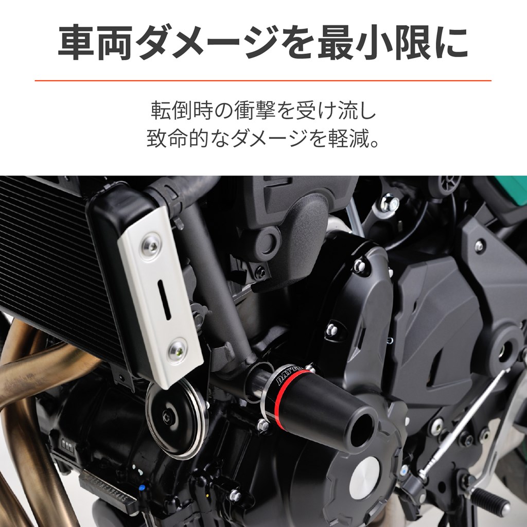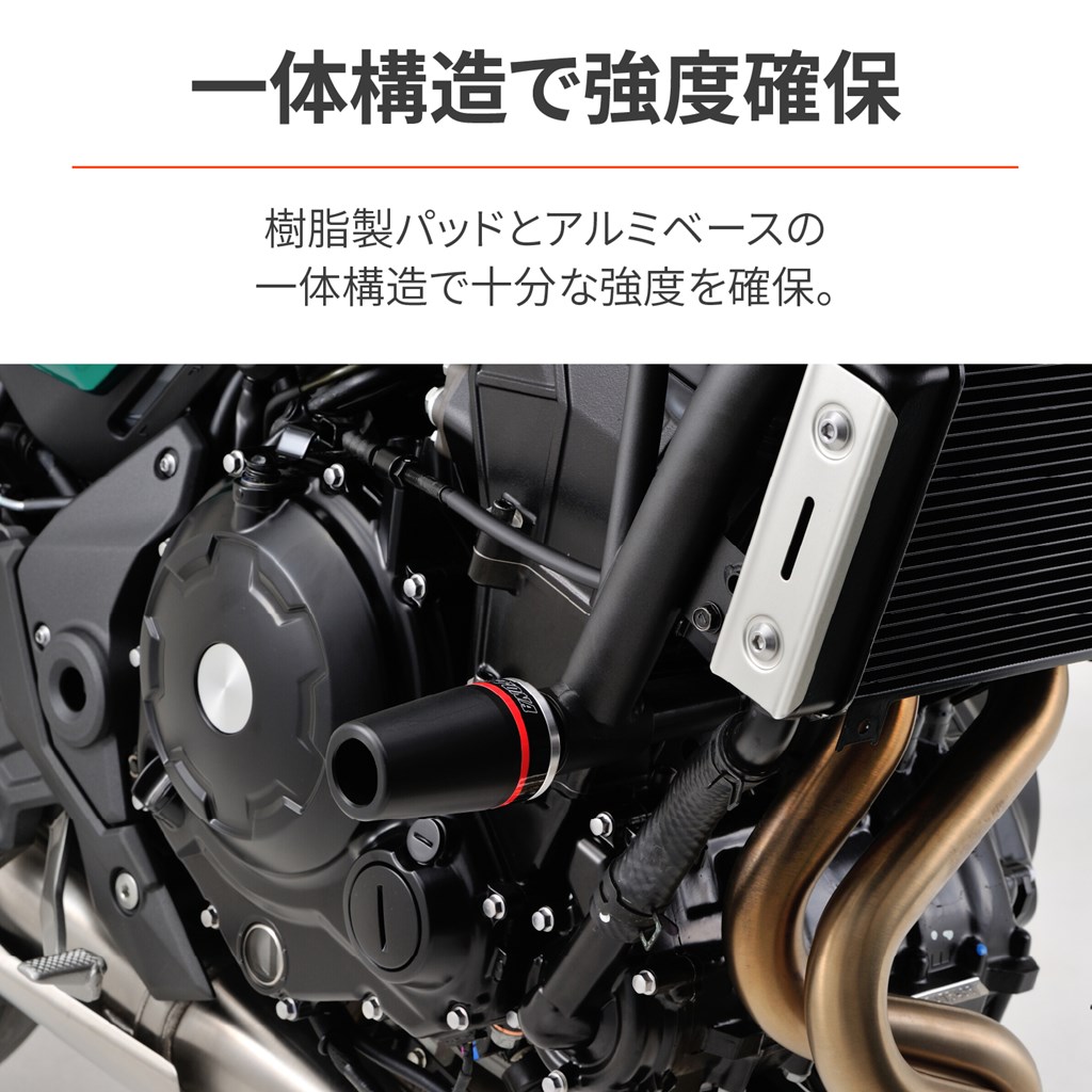 樹脂製パッドとアルミベースの一体構造により十分な強度を確保。転倒時の衝撃を受け流し、クランクケース割れなどの致命的なマシンダメージを最小限に軽減。車種専用設計でボルトオン装着が可能です。補修部品は片側のみのキットやパッド単体など細かくご用意しています。転倒時の衝撃を受け流し、クランクケース割れなどの致命的なダメージを軽減樹脂製パッドとアルミベースの一体構造により十分な強度を確保補修用としてパッド単体(品番:79954)でリペアも可能ボルトオン設計で簡単取付※カワサキ純正アクセサリーの「フレームスライダー」、デイトナ社製パイプエンジンガードとの同時装着はできません。